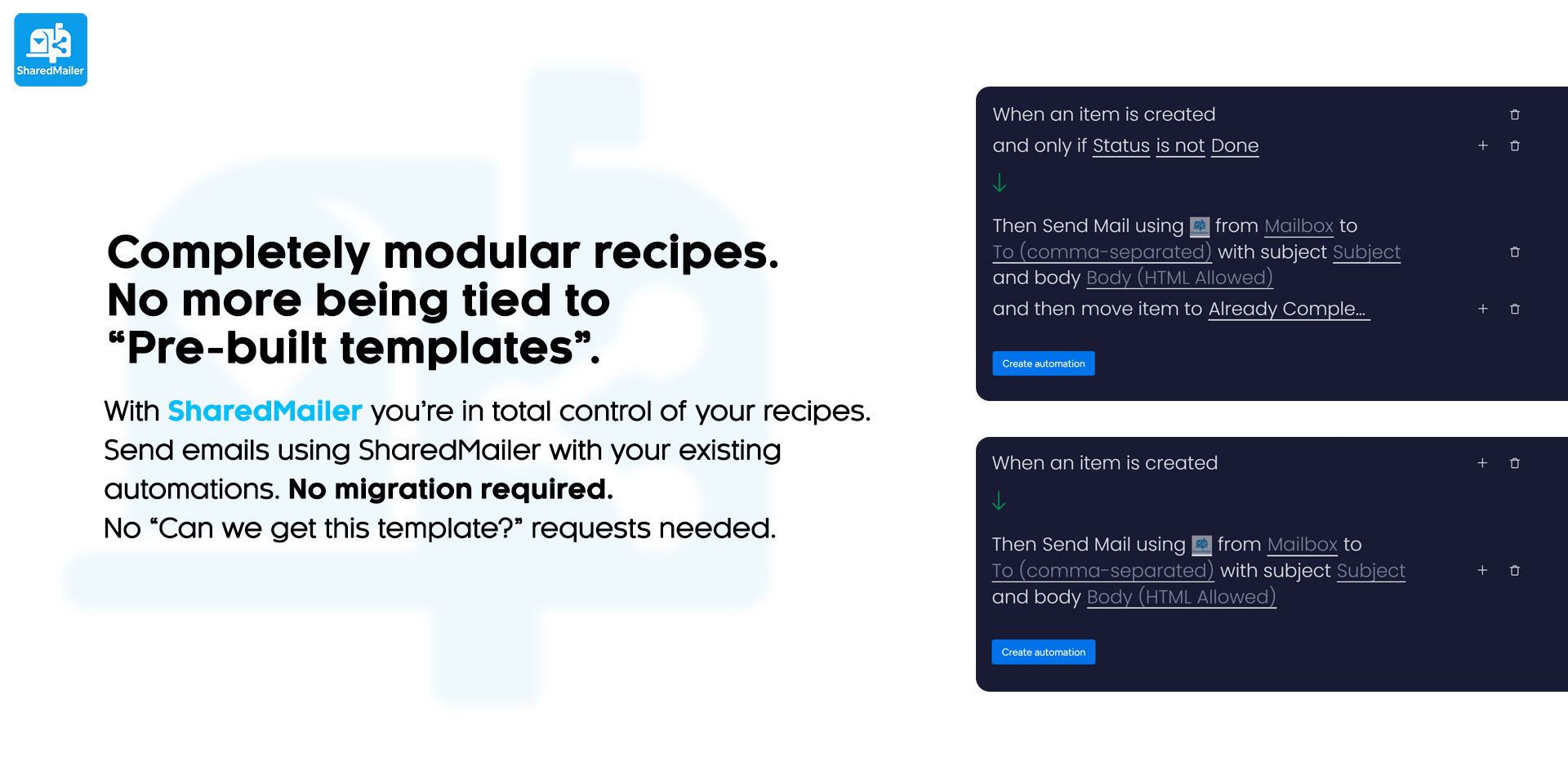 • Need complex automation? Our action block allows you to send emails from anycustom monday.com automation you already have - let SharedMailer bring your flows to life.