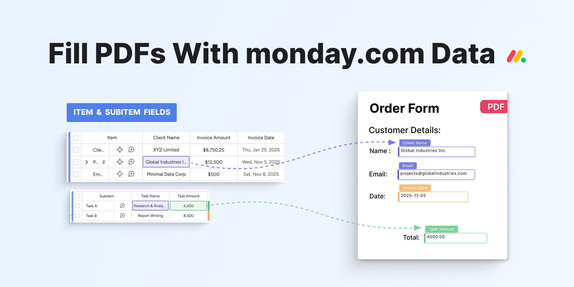 PDF Template Filler lets you upload your own branded PDF templates and automatically fill them with monday.com item and subitem data - no template rebuilding required!