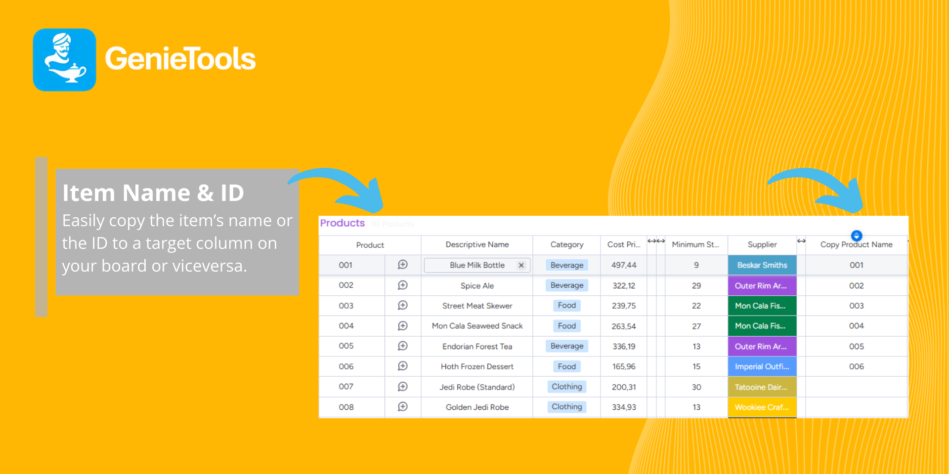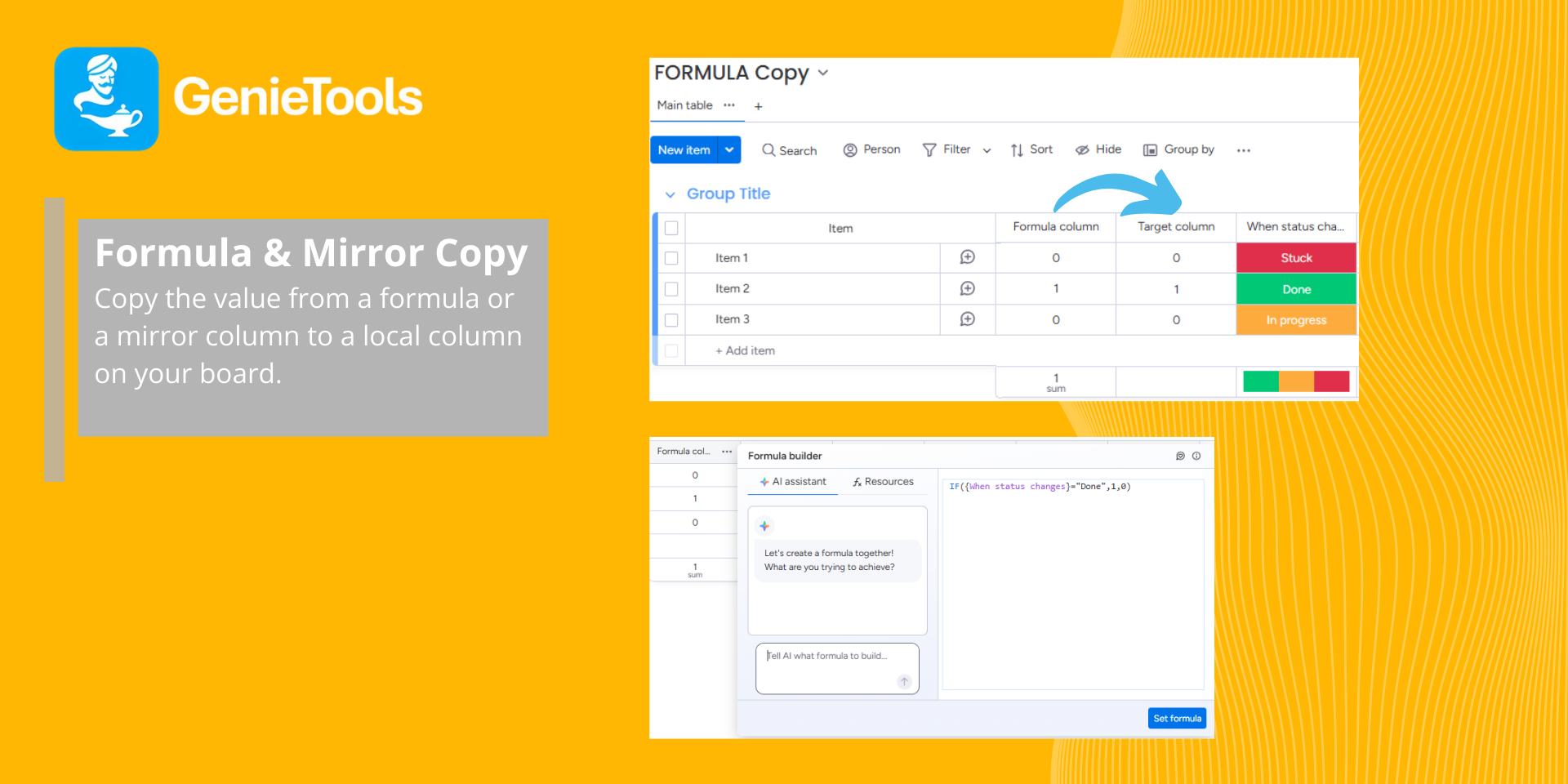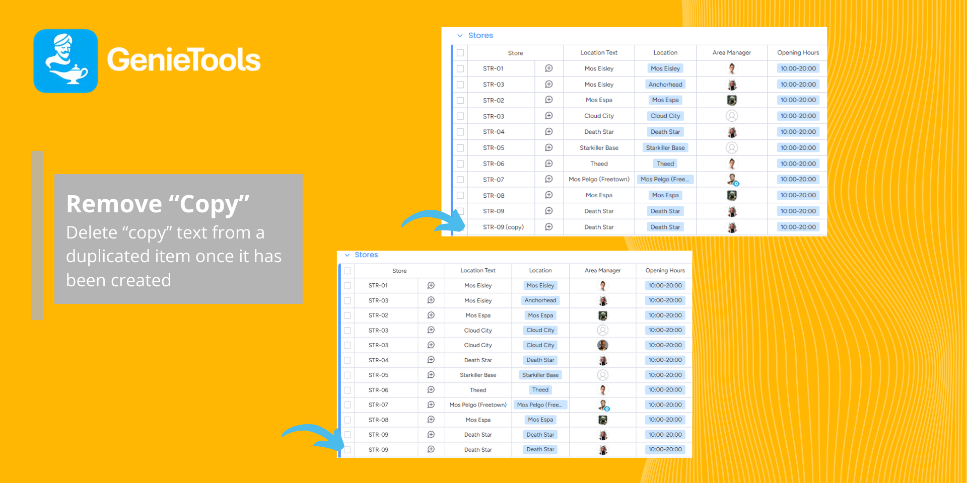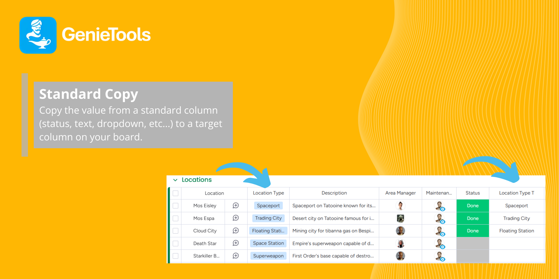 "description": "<p><strong>GenieTools for monday.com</strong></p><p>Unleash the power of automation beyond native limits.</p><p>GenieTools is your all-in-one assistant to streamline workflows, reduce manual work, and supercharge your team's productivity.</p><p>π₯ <a href=\"https://youtu.be/2FY8Ec7wyP8?si=68O-SvzBO1B2QGIY\" rel=\"noopener noreferrer\" target=\"_blank\"><strong>Watch a demo video</strong></a></p><p><br></p><p><strong>π οΈ Core Features</strong></p><p><strong>π Copy Column Values</strong></p><p>Effortlessly copy data from one column to another, including:</p><ul><li>Standard columns (Text, Status, etc.)</li><li>Formula columns</li><li>Mirror columns</li><li>Item ID</li><li>Item Name</li></ul><p><strong>π₯ Smart Assignment Based on Master Board</strong></p><p>Automatically assign people or teams using a centralized configuration board.</p><p><strong>π§½ Duplicate Cleaner</strong></p><p>Instantly remove the β(copy)β suffix from duplicated items for cleaner boards.</p><p><strong>π More powerful features coming soon!</strong></p><p>GenieTools is constantly evolving β stay tuned for exciting updates.</p><p><strong>π Why Choose GenieTools?</strong></p><ul><li>π§ Goes far beyond mondayβs native automations</li><li>π§ Minimizes manual corrections and maintenance</li><li>β‘ Boosts team efficiency and consistency</li><li>π§ Centralizes team assignments and data logic</li></ul><p>Ready to make your boards smarter and your team faster?</p><p><strong>Try GenieTools today and experience the magic! πͺ</strong></p><p><strong>π¬ Help & Support</strong></p><ul><li>β <a href=\"https://holisticds.com/genietools/#faqs\" rel=\"noopener noreferrer\" target=\"_blank\">FAQs</a></li><li>π <a href=\"https://holisticds.com/genietools/genietools-how-to-use/\" rel=\"noopener noreferrer\" target=\"_blank\">App Documentation</a></li><li>π¨ Questions? <a href=\"https://holisticds.com/genietools/#contact\" rel=\"noopener noreferrer\" target=\"_blank\">Contact us</a></li><li>π 100% GDPR/DSGVO compliant: <a href=\"https://holisticds.com/genietools/genietools-privacy-policy/\" rel=\"noopener noreferrer\" target=\"_blank\">App Security & Privacy</a></li></ul>",