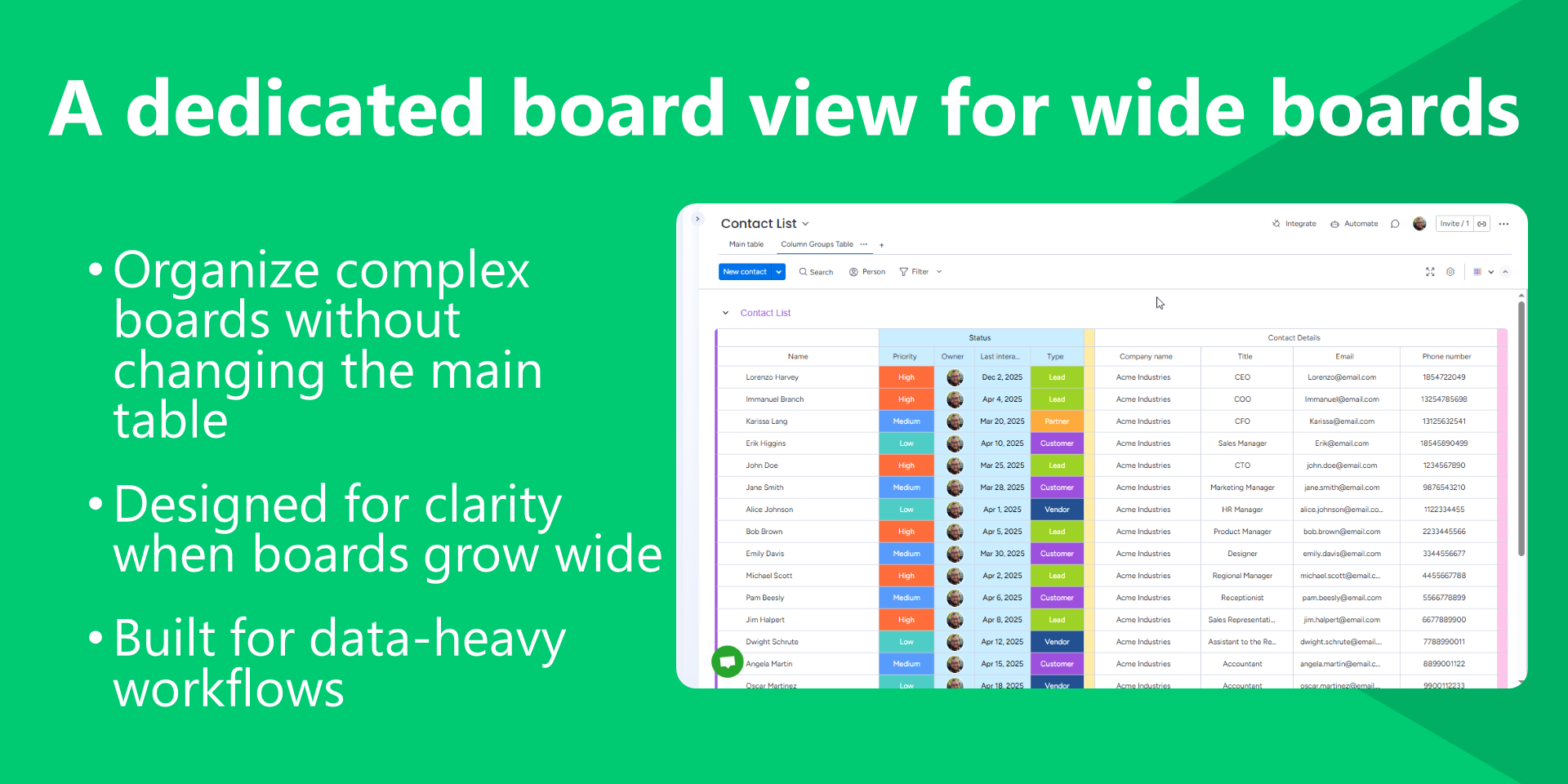 Column Groups adds a dedicated board view that helps teams make sense of wide, data-heavy boards by grouping columns vertically. Instead of endlessly scrolling or constantly hiding columns, you get a structured view designed for clarity and readability.