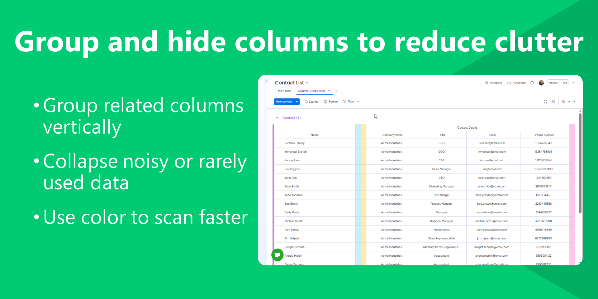 - Group related columns: Organize columns into clear vertical groups such as customer information, tracking data, project details, or internal notes. This makes large boards easier to understand at a glance.