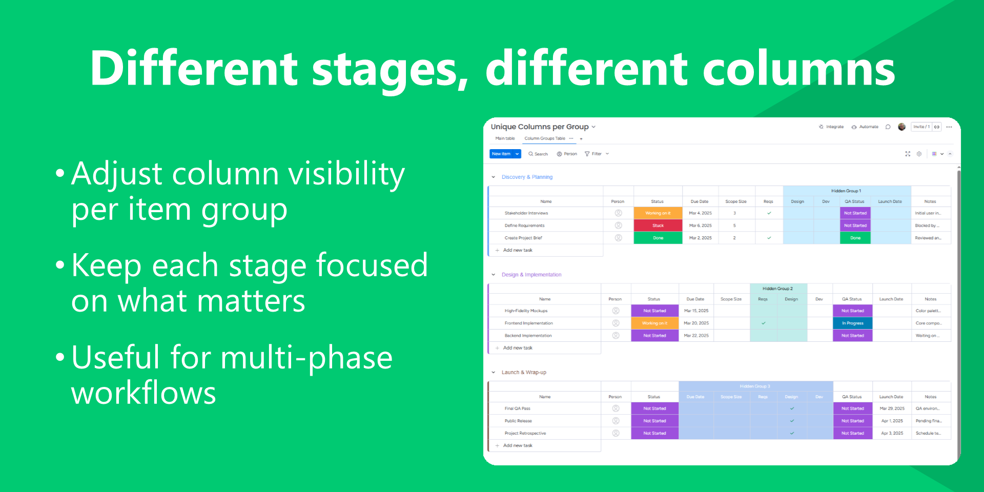 - Customize by item group: Use different column groupings for different horizontal item groups. This is especially useful for multi-phase workflows where each stage has different information to display.