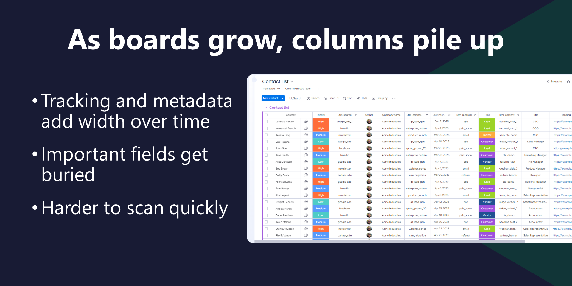 As boards grow, they often accumulate extra columns from integrations, forms, tracking fields, and internal metadata. While that data is useful, it can make boards hard to scan and difficult to work in day to day.