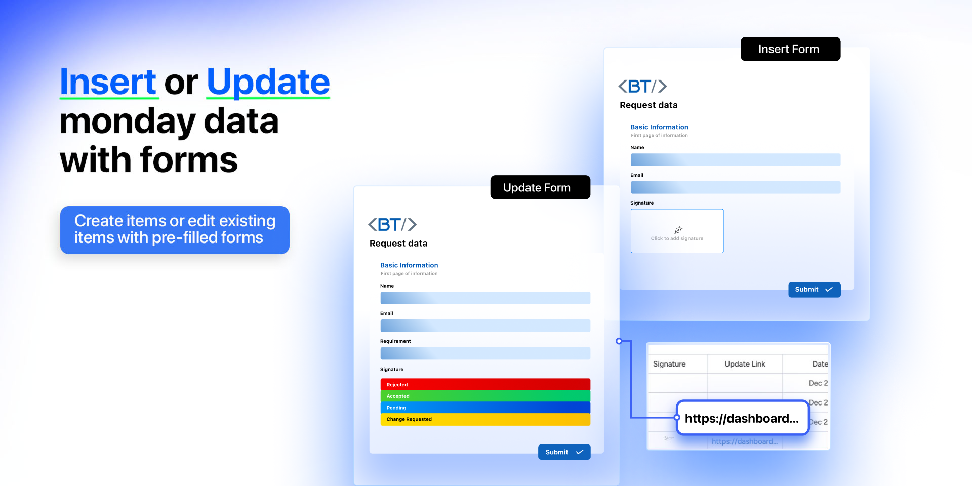 "description": "<p>FormFlow helps you create modern, multi-step forms for monday.com with full board column support.</p><ul><li><strong>Insert Forms</strong> to collect new submissions and automatically create items in your board.</li><li><strong>Update Forms</strong> (Editable Link) with pre-filled forms so users can review and update existing item data securely.</li></ul><p>Everything syncs directly to your monday.com board, with full branding, restrictions, and analytics.</p><p><br></p><p>🎯 <strong>Book a Demo</strong></p><p><a href=\"https://calendly.com/formflow/30min\" rel=\"noopener noreferrer\" target=\"_blank\">Book a personalised demo</a> to see FormFlow in action and get the best setup for your boards.</p><p><br></p><p><strong>Comprehensive Features</strong></p><ul><li><strong>Insert + Update Forms</strong>: Create new items or update existing monday.com data using one form builder.</li><li><strong>Drag-and-Drop Multi-Step Builder</strong>: Build clean multi-step forms that improve completion rates and make long forms easy to fill.</li><li><strong>Forms Routing (NEW):</strong> Show different forms from a single link using rule-based conditions (AND/OR) from your monday.com item fields.</li><li><strong>monday.com Column Support</strong>: Add board columns directly into the form and sync responses back to your board.</li><li><strong>Submission Rules</strong>: Allow/block resubmits, set limits, custom messages, and thank-you/redirect.</li><li><strong>Analytics</strong>: Track submissions with insights like country, OS, and browser.</li><li><strong>Time + Country Restrictions</strong>: Limit submissions by time window and allowed countries with custom messages.</li><li><strong>Security</strong>: Google reCAPTCHA / Cloudflare Turnstile, custom CAPTCHA errors, and password protection (including update validation via password column).</li><li><strong>Branding + Layout</strong>: Theme templates + full customization, logo upload, and layout controls.</li><li><strong>Signature + Block</strong>: Add rich text, images, links, and signature fields.</li></ul><p><br></p><p><strong>Use cases</strong></p><ul><li>Internal requests and approvals (IT, HR, finance) synced to monday.com boards</li><li>Onboarding for employees, clients, and vendors using multi-step forms</li><li>Event registrations and signups with limits, time windows, and country restrictions</li><li>Forms Routing: one link that shows different forms based on status, type, priority, or any condition</li><li>Pre-filled edit forms for approvals, profile updates, and order or status changes</li></ul><p><br></p><p><strong>Support</strong></p><p><strong>Need help with setup or troubleshooting? Contact us anytime.</strong></p><p><strong>Website: </strong><a href=\"https://formflow.baruzotech.com/\" rel=\"noopener noreferrer\" target=\"_blank\">https://formflow.baruzotech.com/</a></p><p><strong>Email: </strong><a href=\"mailto:formflow@baruzotech.com\" rel=\"noopener noreferrer\" target=\"_blank\">formflow@baruzotech.com</a></p>",