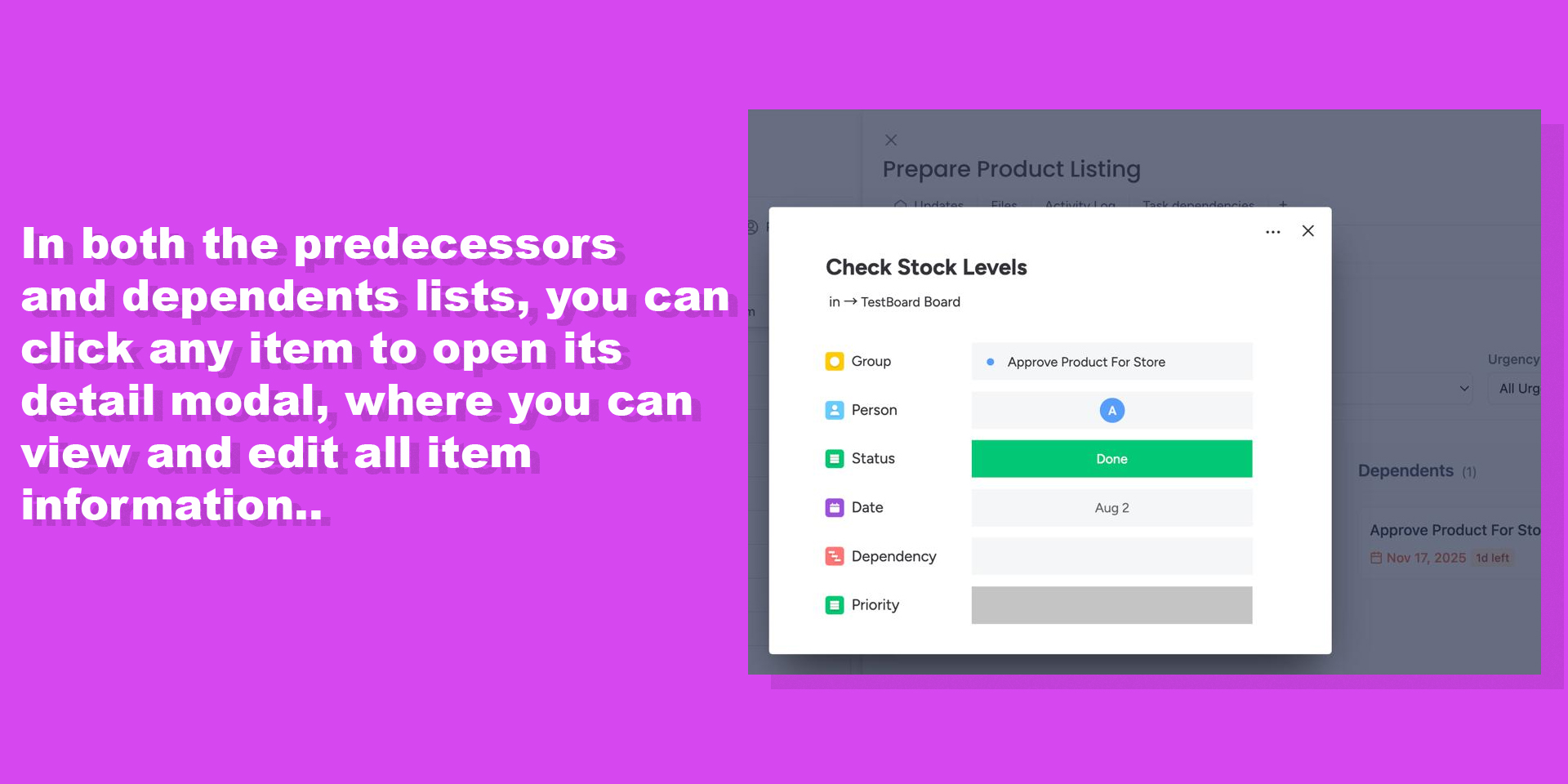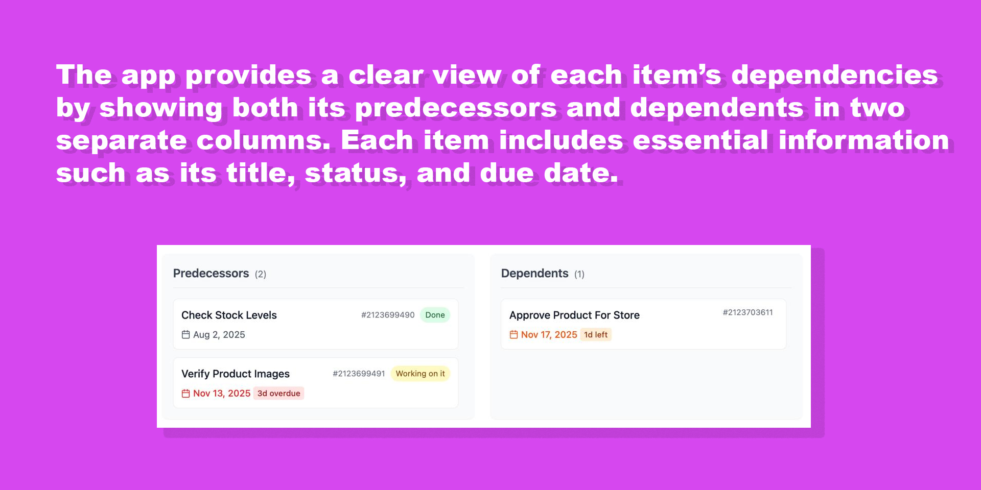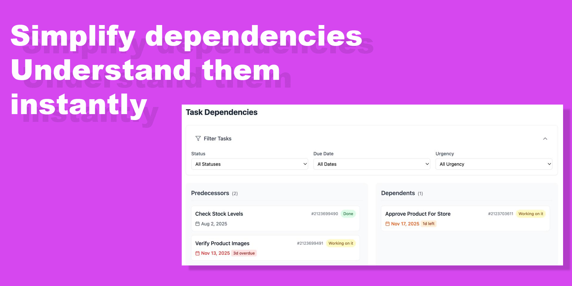 "description": "<p><strong>Two-Way Dependencies</strong> gives you a complete, instant overview of how your work connects inside <a href=\"http://monday.com/\" rel=\"noopener noreferrer\" target=\"_blank\">monday.com</a>. Within any item, it clearly displays both what your current task depends on (<strong>predecessors</strong>) and what depends on it (<strong>dependents</strong>) — helping you spot blockers, prerequisites, and critical paths in seconds.<strong>Key benefits:</strong></p><ul><li><strong>Instantly visualize</strong> upstream (predecessors) and downstream (dependents) dependencies</li><li><strong>Filter tasks</strong> by status, due date, or urgency to focus on what matters</li><li><strong>Prevent delays</strong> by identifying which tasks are blocked or blocking others</li><li><strong>See complete task details</strong> (name, status, due date) without leaving the item page</li><li><strong>Keep teams aligned</strong> with a clean, side-by-side view directly in your workflow</li></ul><p><strong>Use cases</strong>:</p><ul><li><strong>Project managers</strong> tracking interrelated tasks and identifying bottlenecks before they cause delays</li><li><strong>Product owners</strong> ensuring all prerequisites are completed before launching features</li><li><strong>Developers</strong> reviewing what needs to be done before they can start coding</li><li><strong>Team leads</strong> monitoring which team members are blocked and need support</li></ul><p>Designed to be <em>fast</em>, lightweight, and intuitive — no complex Gantt charts or board switching required. Everything you need is right where you're already working.</p><p><br></p><p>📖 <a href=\"https://dalshenekuda.github.io/task-manager-privacy/how-to-use.html\" rel=\"noopener noreferrer\" target=\"_blank\"><strong>How to Use Guide</strong></a> | 💰 <a href=\"https://dalshenekuda.github.io/task-manager-privacy/pricing.html\" rel=\"noopener noreferrer\" target=\"_blank\"><strong>View Pricing</strong></a> | 🔒 <a href=\"https://dalshenekuda.github.io/task-manager-privacy/privacy.html\" rel=\"noopener noreferrer\" target=\"_blank\"><strong>Privacy Policy</strong></a></p>",