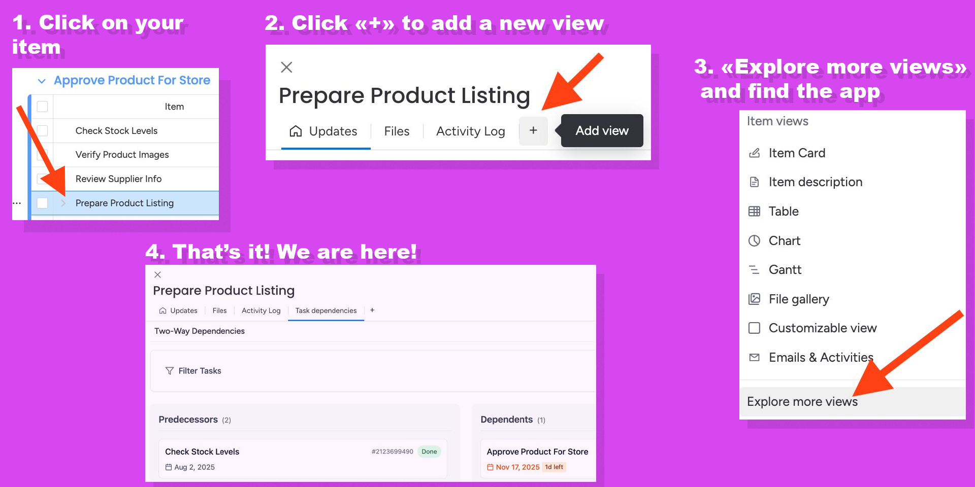 Two-Way Dependencies gives you a complete, instant overview of how your work connects inside monday.com. Within any item, it clearly displays both what your current task depends on (predecessors) and what depends on it (dependents) — helping you spot blockers, prerequisites, and critical paths in seconds.Key benefits: