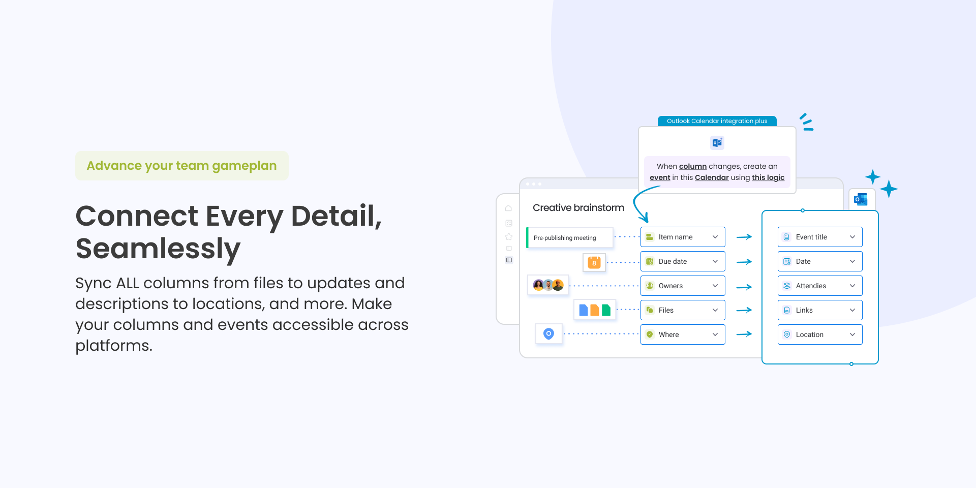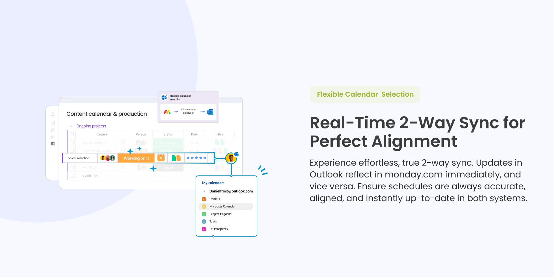 Experience effortless, 2-way sync. Updates in Outlook reflect in monday.com immediately, and vice versa. Ensure schedules are always accurate, aligned, and up-to-date in both systems.