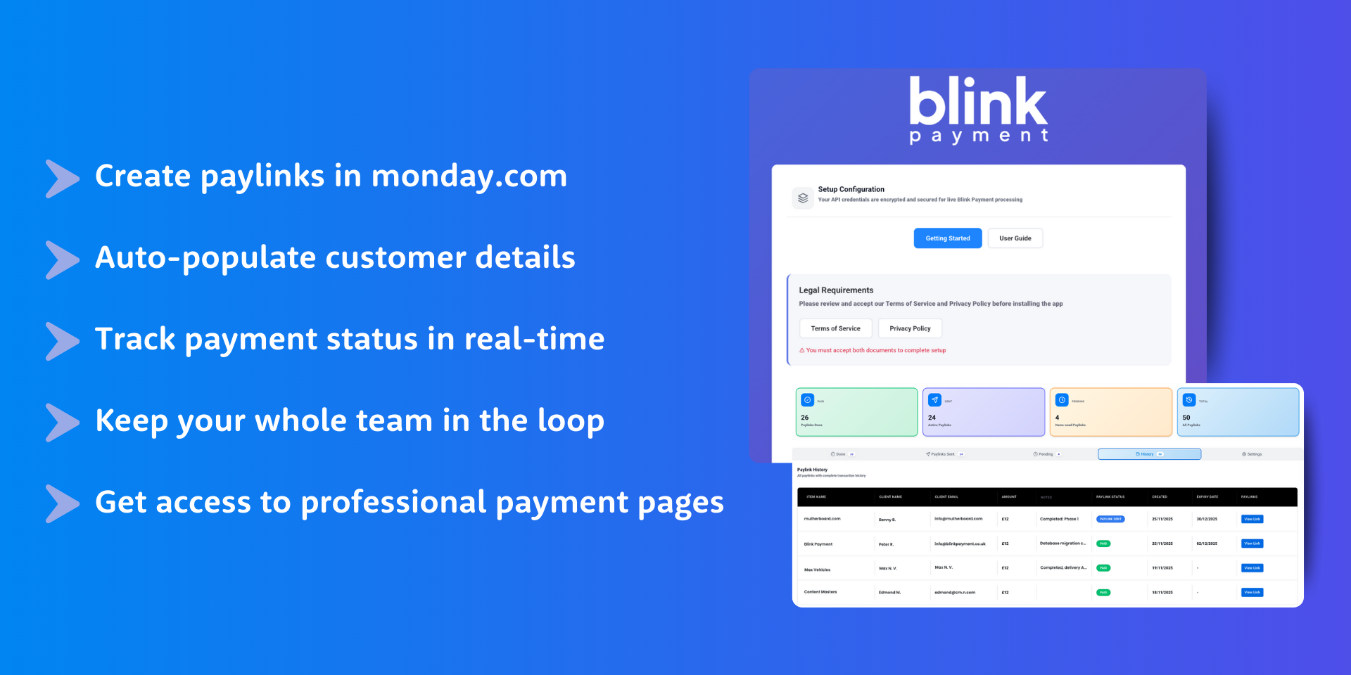 Say goodbye to switching between multiple platforms, copying data, and manually tracking payment statuses. Our app brings the power of Blink Payment's secure payment processing directly into your monday.com workflow, automating everything from link creation to status updates.