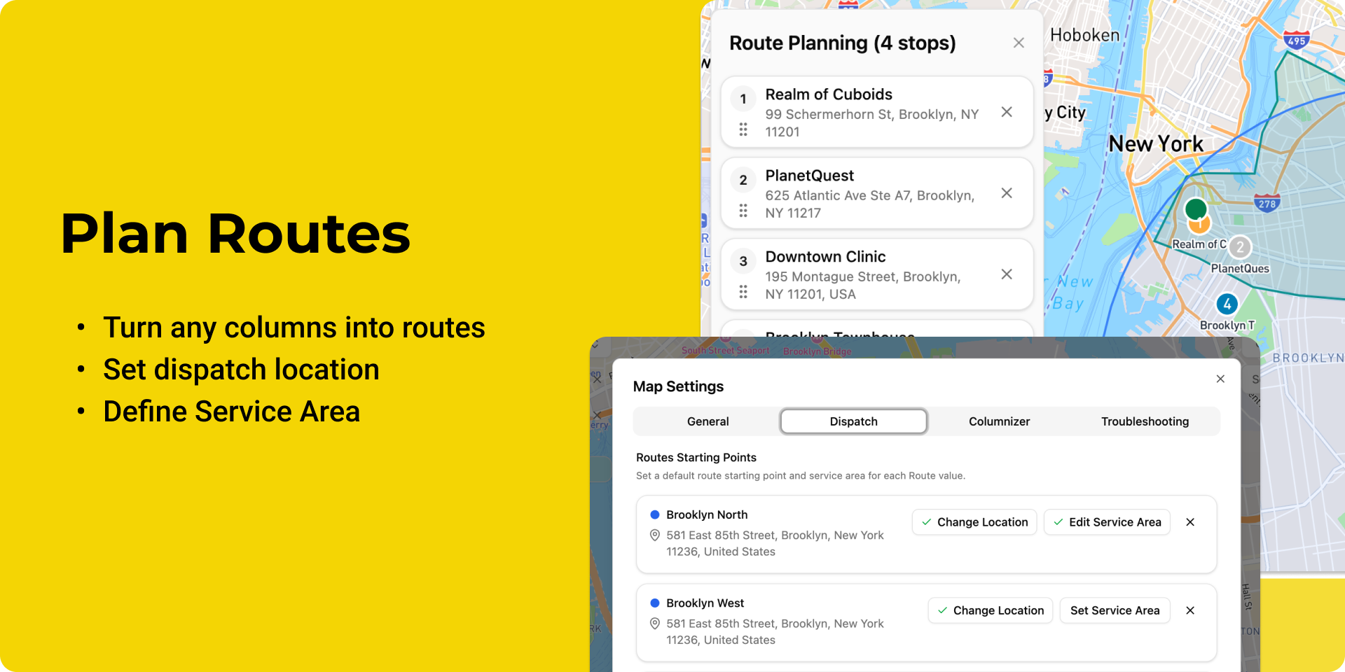 "description": "<p><strong>Maps • GPS • Location • Routes • Service area • Stops • Fastest route</strong> - all you looking for and more 🚀</p><p>Turn any <a href=\"http://monday.com/\" rel=\"noopener noreferrer\" target=\"_blank\">monday.com</a> board into a live <strong>Map</strong> to plan routes, manage service coverage, plan and dispatch teams faster.</p><p><strong>Why teams install this app ✅</strong></p><ul><li>📍 <strong>See every address on a map</strong> to understand territory and workload instantly</li><li>🔎 <strong>Filter by location + board data</strong>: new, due today, due date, assigned agent, route, status, group</li><li>🧭 <strong>Build the fastest route</strong>: select stops, set dispatch location, auto-optimize by time/distance</li><li>☎️ <strong>Close and schedule faster</strong>: confirm <strong>service area</strong> coverage during a sales call</li><li>✏️ <strong>Work from the map</strong>: create and edit items right from pins (syncs to your board)</li><li><strong>🗺️ Splits monday addresses into components:</strong> Address, City, Zip – so you can run automations and filters on items</li></ul><p><strong>What you can do ⚙️</strong></p><ul><li>🗺️ Plot all item <strong>Addresses / GPS / Location</strong> pins</li><li>🚗 Create <strong>Routes</strong> from filtered items (<strong>Stops for a day,</strong> etc)</li><li>🏁 Set a dispatch origin and optimize Locations order</li><li>🧩 Define <strong>Service areas</strong> (add as many as you want) and request census data</li><li>📲 Export/open routes in <strong>GPS</strong> navigation (Google Maps)</li><li>⚙️ Run <strong>automations</strong> and filters</li></ul><p><strong>Best for 🎯</strong></p><ul><li>🧰 <strong>Home service businesses</strong>: dispatch, technicians, route managers</li><li>🚚 <strong>Sales & logistics teams</strong>: multi-stop planning and daily routing</li><li>🏘️ <strong>Location-based sales & RE pros</strong>: prospecting, territory planning, area creation</li></ul><p><br></p><p>Best interface and service from well-known <a href=\"http://monday.com/\" rel=\"noopener noreferrer\" target=\"_blank\">monday.com</a> Partners.</p><p>Simple pricing and human support.</p>",