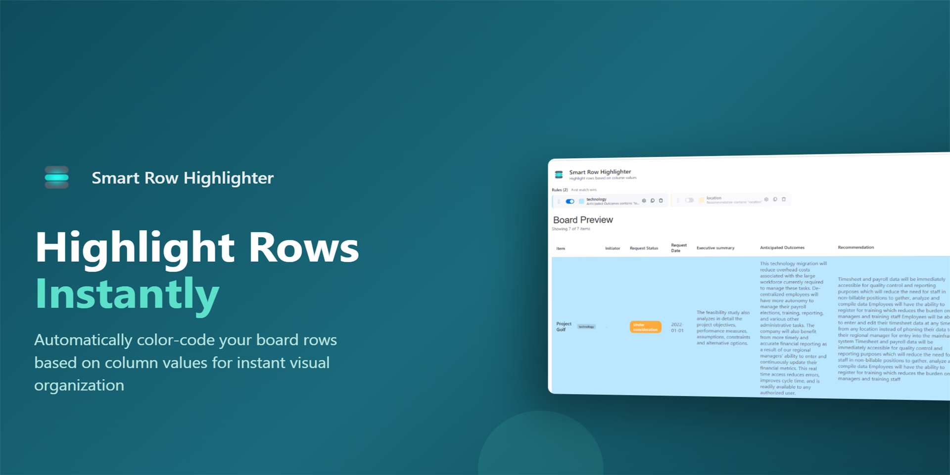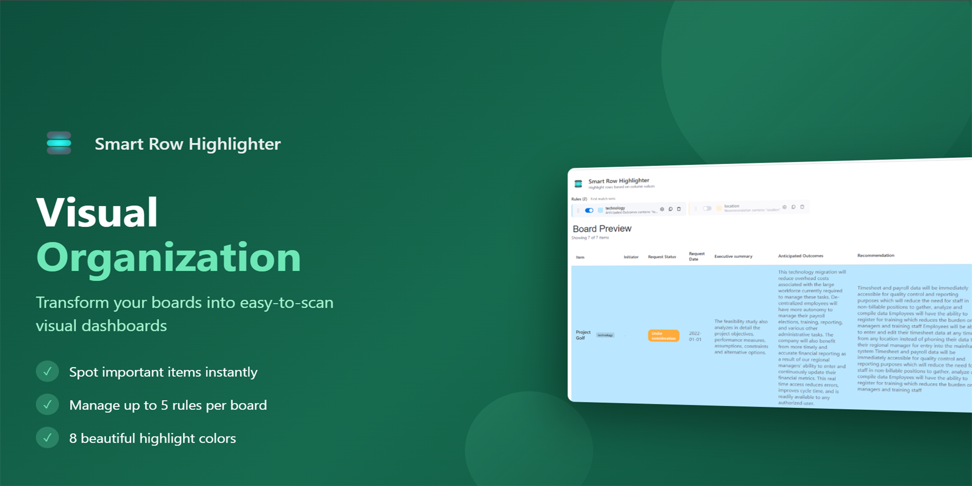 "description": "<p>Smart Row Highlighter automatically highlights rows in your <a href=\"http://monday.com/\" rel=\"noopener noreferrer\" target=\"_blank\">monday.com</a> boards based on conditional rules you define. Make important items stand out instantly!</p><p><br></p><p>KEY FEATURES:</p><p><br></p><p>• Rule-Based Highlighting - Create rules that evaluate column values and apply colors to matching rows</p><p><br></p><p>• Multiple Conditions - Combine conditions with AND/OR logic for powerful filtering (e.g., \"Status = Done AND Due Date is overdue\")</p><p><br></p><p>• 15+ Operators - equals, contains, starts with, ends with, regex, greater than, less than, is overdue, is today, is this week, and more</p><p><br></p><p>• All Column Types - Works with Status, Text, Numbers, Date, Checkbox, and People columns</p><p><br></p><p>• Drag & Drop Priority - Reorder rules to control which highlighting takes precedence</p><p><br></p><p>• Export & Import - Share your rule configurations across boards or with team members</p><p><br></p><p>• Real-Time Preview - See highlighting applied instantly as you create and modify rules</p><p><br></p><p>• Dark Mode Support - Looks great in both light and dark themes</p><p><br></p><p>PERFECT FOR:</p><p><br></p><p>- Project managers tracking overdue or at-risk tasks</p><p>- Sales teams highlighting high-value opportunities</p><p>- HR teams flagging pending approvals</p><p>- Support teams identifying urgent tickets</p><p>- Anyone who wants better visual organization</p><p><br></p><p>Free users get 5 powerful rules per board. With multiple conditions per rule, that's more than enough for most workflows!</p><p><strong>Need help?</strong> Contact us at <a href=\"https://leongael.xyz/contact\" rel=\"noopener noreferrer\" target=\"_blank\">https://leongael.xyz/contact</a></p>",
