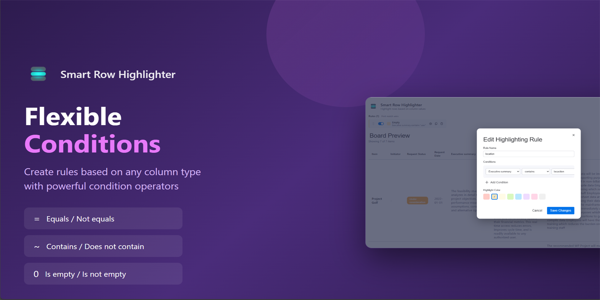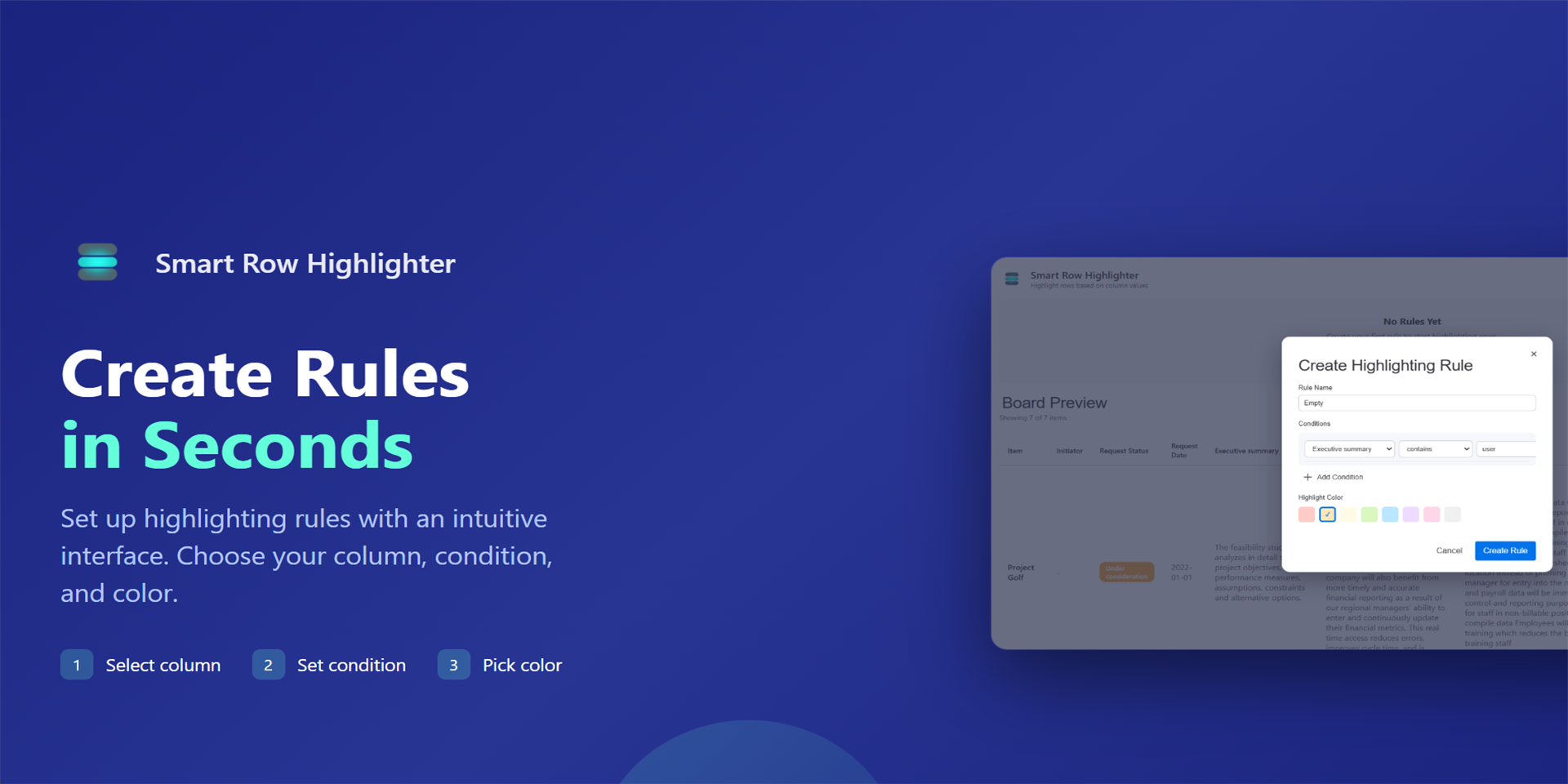 "description": "Unlimited highlighting rules to make important rows stand out instantly based on status, dates, priority and more",