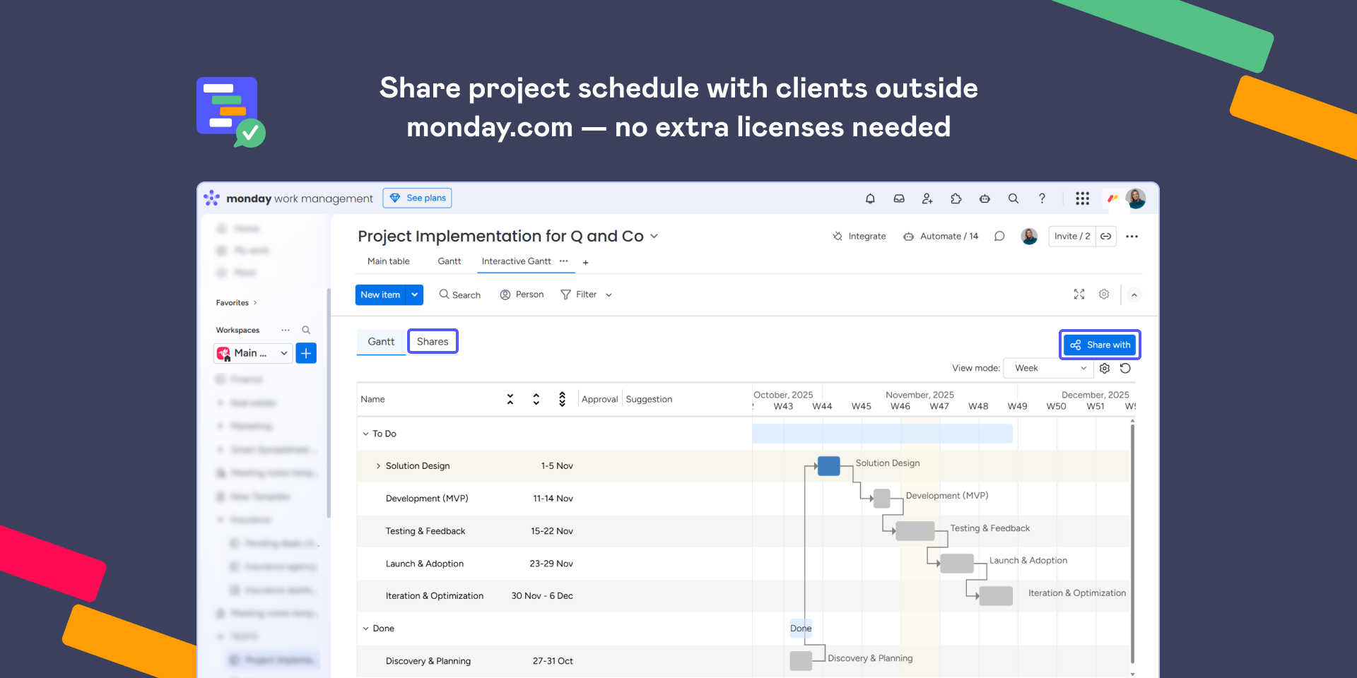 Clients and external stakeholders can comment, ask questions, or suggest timeline changes right on the Interactive Gantt Timeline. No monday.com account required, which means fewer license costs and no onboarding hassles.