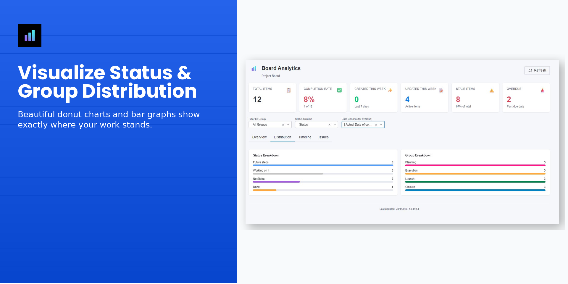 ✓ Works with any Status column ✓ Supports Dark Mode automatically ✓ Filter by group or completion status ✓ Four organized tabs: Overview, Distribution, Timeline, Issues ✓ Real-time data refresh