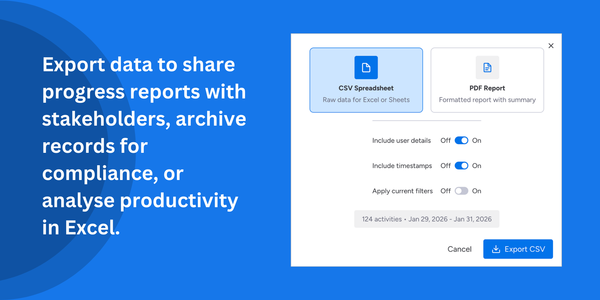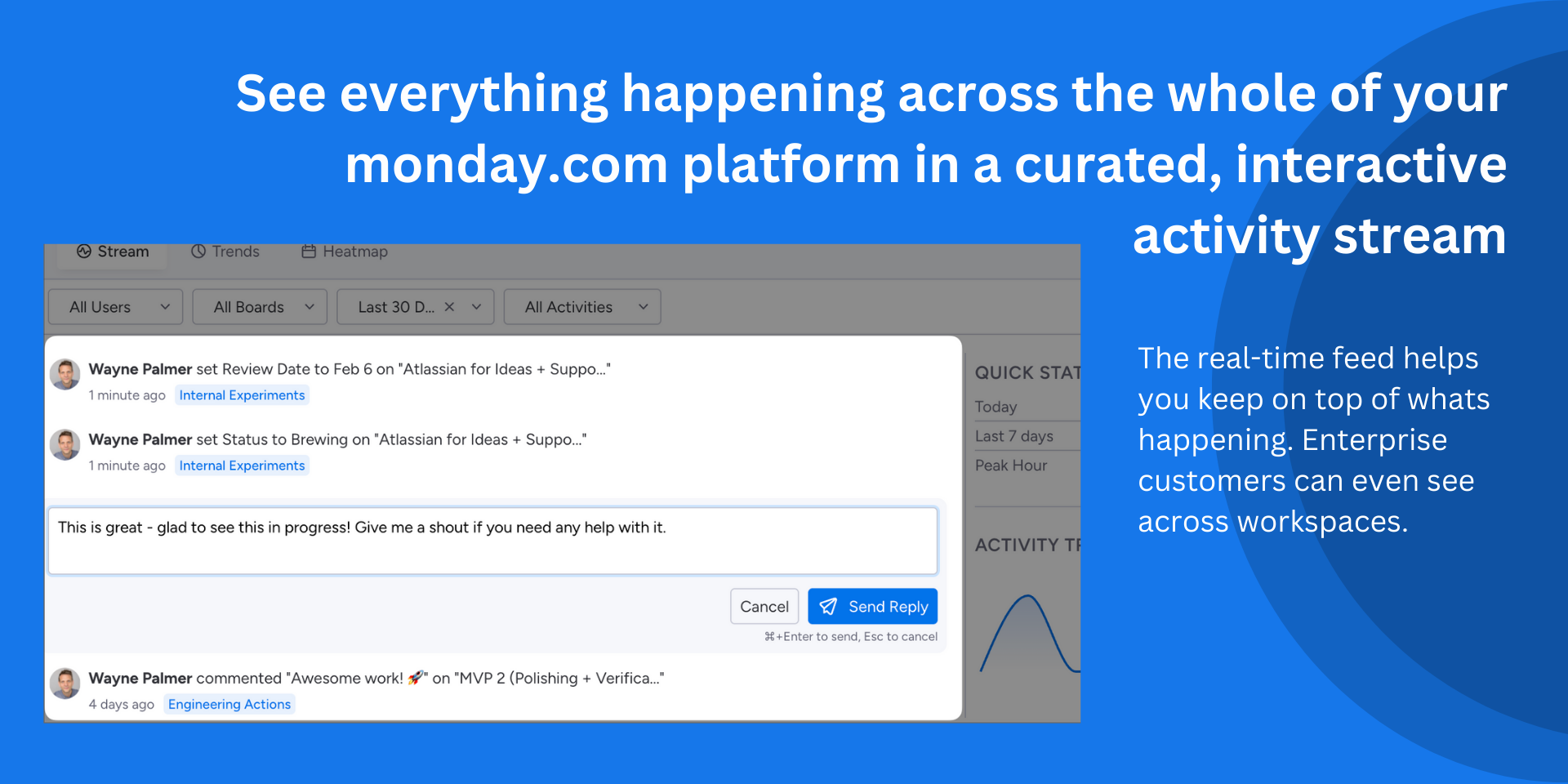 "description": "<p><strong>Stop jumping between boards and see all activity in a single, powerful and interactive dashboard widget.</strong></p><p>Activity Pulse brings all your activities together, regardless of board or workspace. Gain valuable insight into working patterns and trends.</p><p><strong>Unified, curated activity stream</strong></p><p>See item creations, updates, status changes, and assignments from multiple boards and workspaces in real-time.</p><p><strong>Direct replies</strong></p><p>Create item updates directly from the activity stream to keep communication flowing.</p><p><strong>Smart filtering</strong></p><p>Filter by specific boards, team members, activity types, or date ranges to find exactly what you need.</p><p><strong>CSV and PDF export</strong></p><p>Generate CSV or PDF reports of board activity for audits, standups, or stakeholder updates.</p><p><strong>Scale with Your Team</strong></p><p>From small teams to enterprise deployments, Activity Pulse has the ability to grow with you.</p><p>Perfect for managers who need visibility across multiple projects, team leads keeping track of their team’s work or team members trying to keep on top of their teams progress.</p><p>Visit our <a href=\"https://proof.engineering/activity-pulse\" rel=\"noopener noreferrer\" target=\"_blank\">how-to guide</a> for best practices, or <a href=\"https://forms.monday.com/forms/388d9c04ecc6789b1bb6292bd934b69a?r=euc1\" rel=\"noopener noreferrer\" target=\"_blank\">reach out to Proof</a> to understand or request future enhancements!</p>",