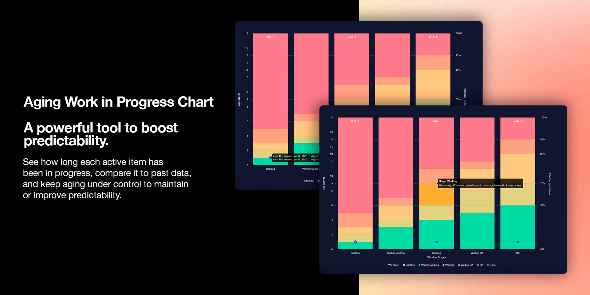 See how long each item has been in progress and compare it to past performance so aging stays under control.This makes risk visible earlier and helps teams focus on finishing before work gets stuck.