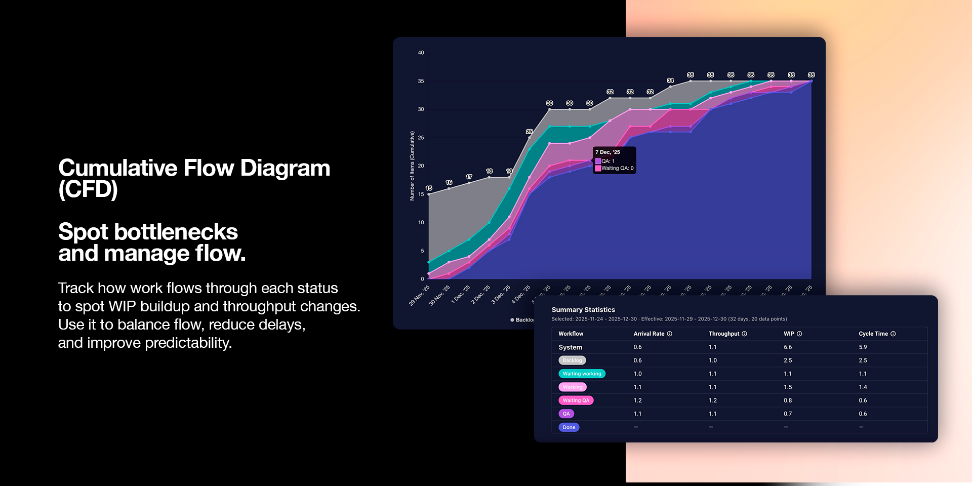 Track how work moves through each status to spot WIP variations or throughput shifts. Use the summary with metrics like arrival rate, throughput, and WIP for deeper analysis.