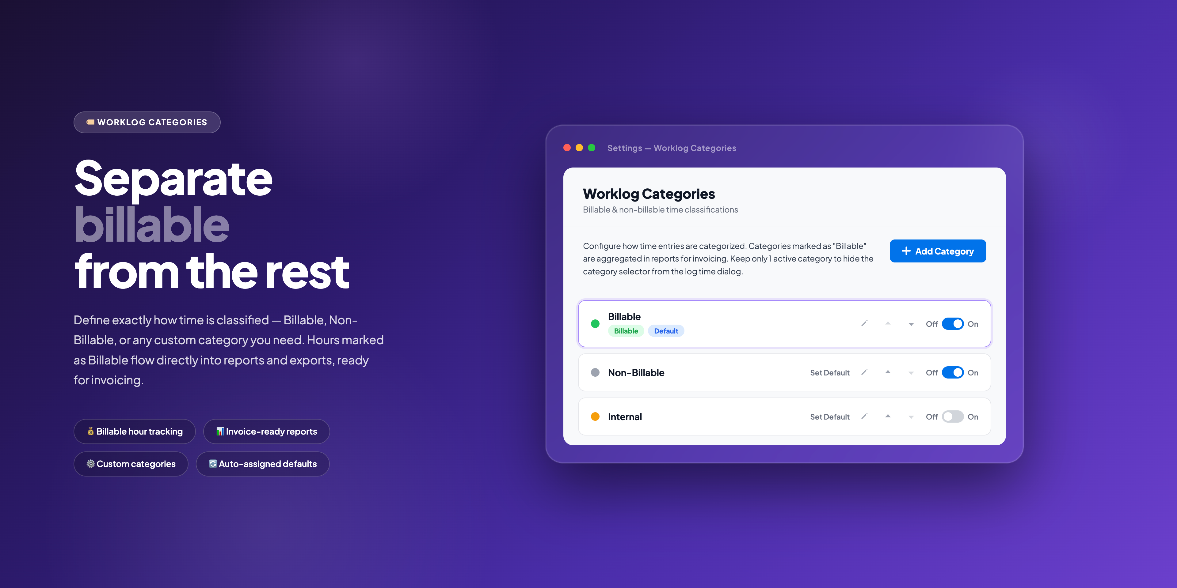 โฑ๏ธ Timesheets & Approvals: Route timesheets through approval workflows. View timesheets by user, by board, or by item - with summary and progress views. Classify worklogs as Billable or Non-Billable with customizable categories. Managers review, approve, or reject - all within monday.com. Ready for payroll, invoicing, and compliance out of the box.