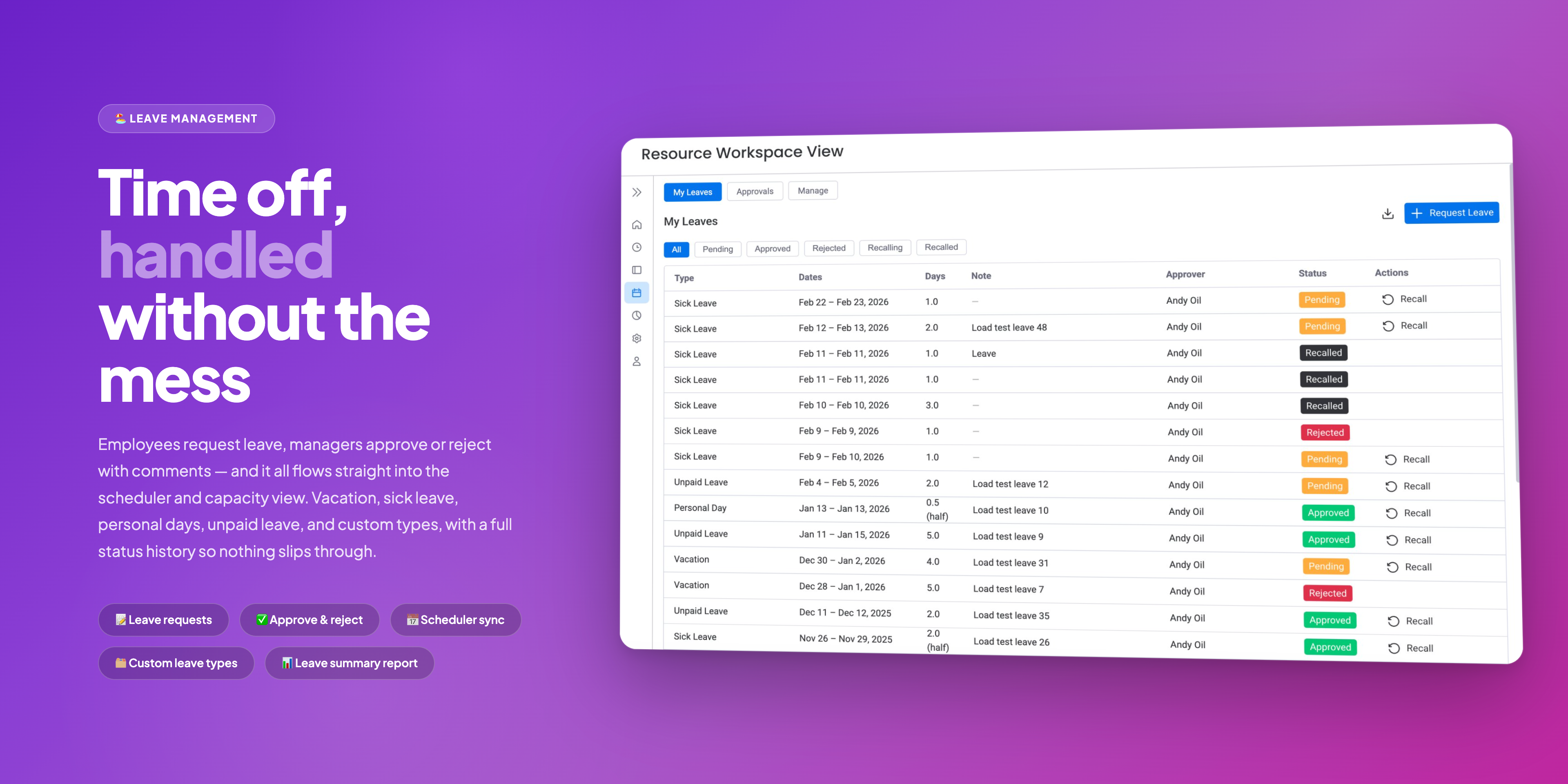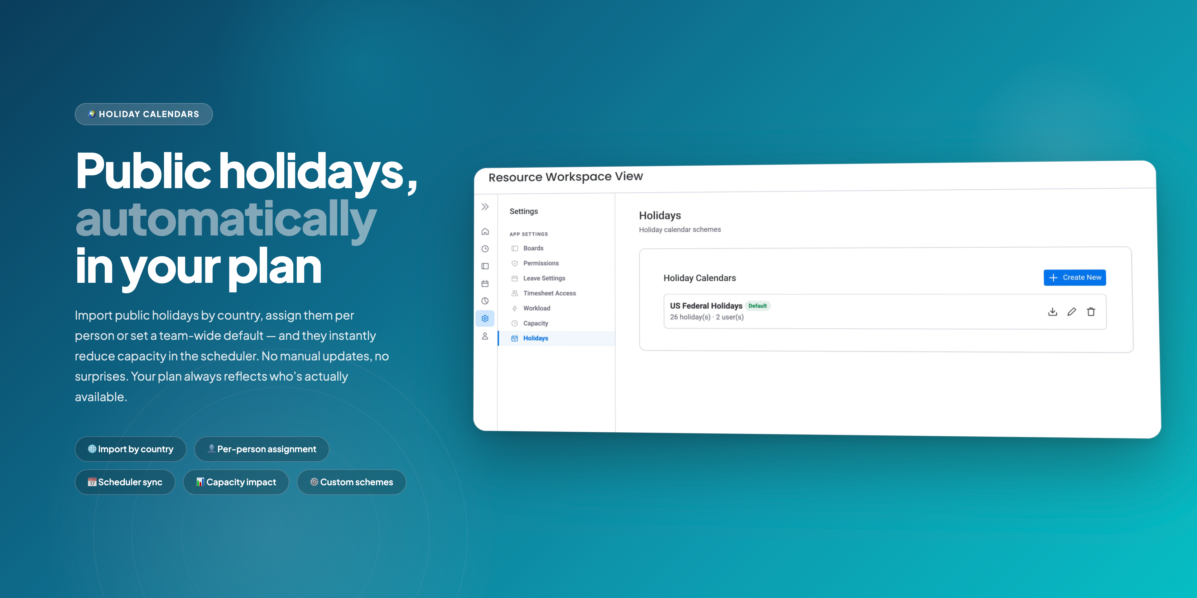 ๐๏ธ Leave & Availability: Request and approve vacation, annual leave, sick leave, and custom types. Import public holidays by country and assign per person or team. Approvals sync instantly to capacity and scheduler - no manual adjustments.