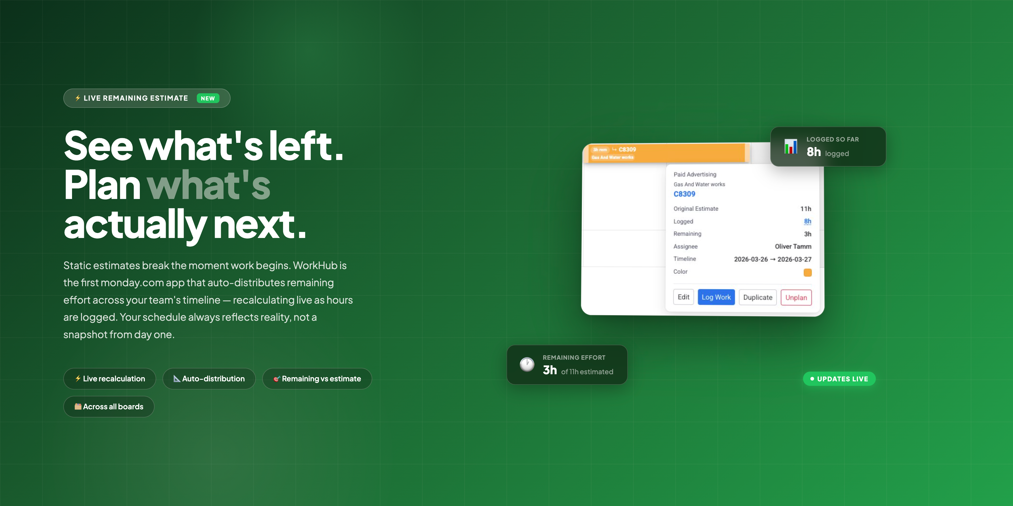 ๐ Remaining Estimates: The first monday.com app that auto-distributes remaining work across future days. As hours are logged, WorkHub recalculates what's left and updates your workload view instantly. Your plan always answers: "Can we still deliver on time?"
