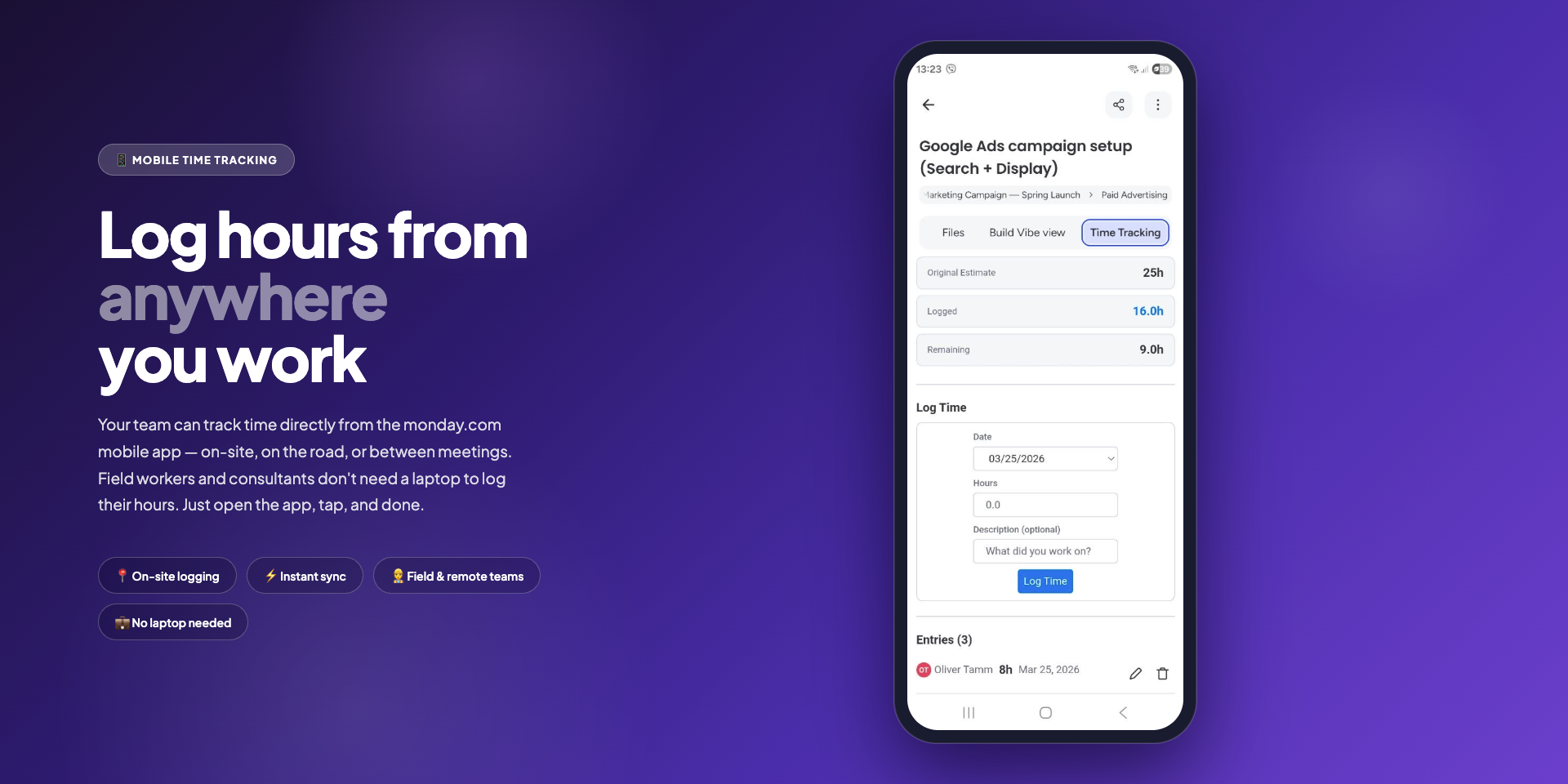 ๐ฑ Mobile Time Tracking: Log work directly from the monday.com mobile app. Open any item, tap the Time Tracking tab, and record hours. See Original Estimate, Logged, and Remaining at a glance. Perfect for field workers, contractors, and remote teams who aren't at a desk.