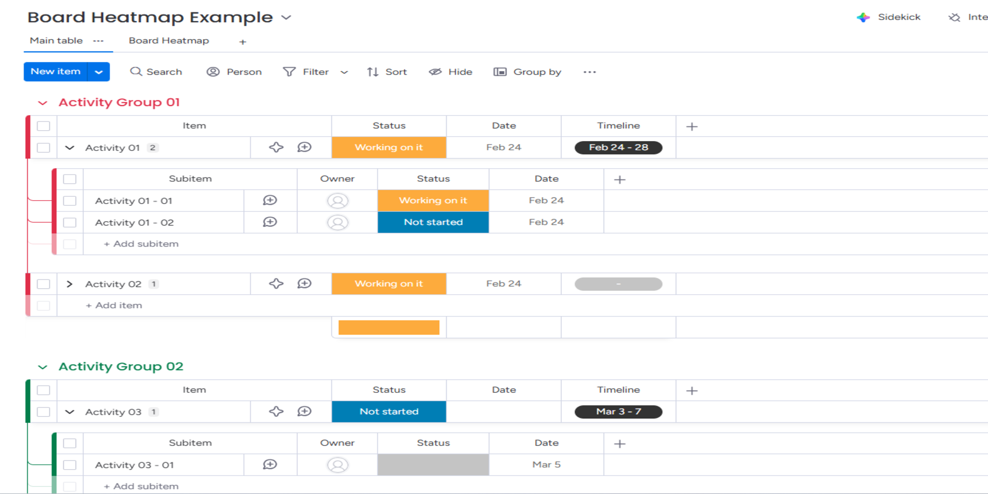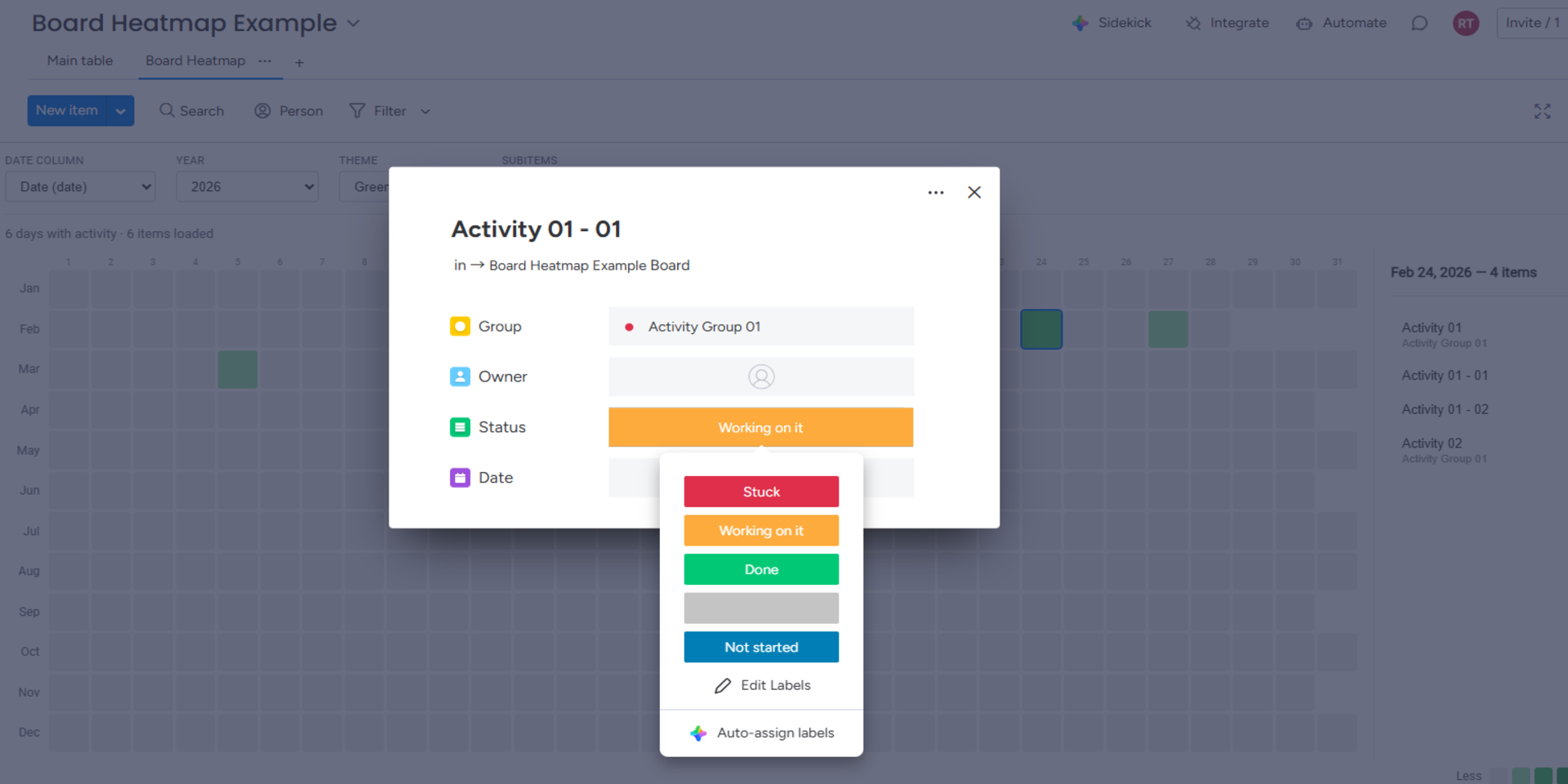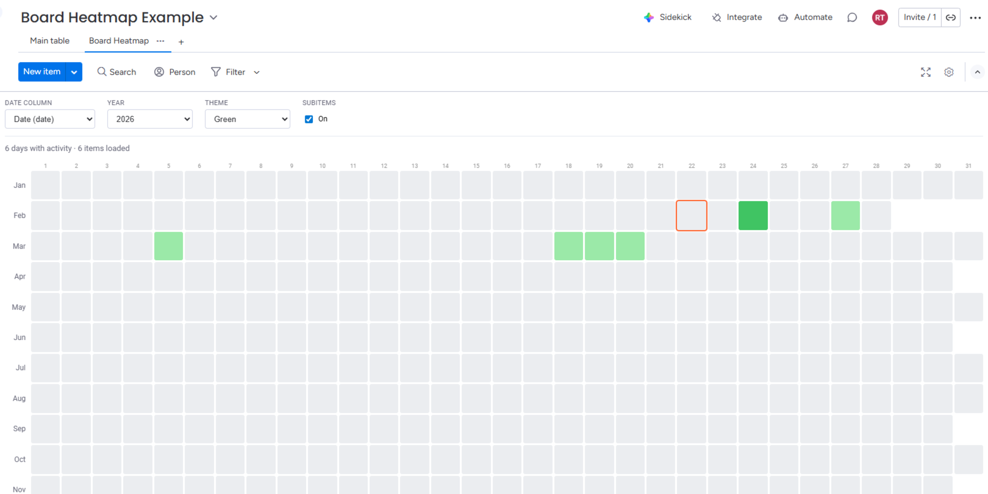 "description": "<p>Board Heatmap turns your board data into a beautiful, interactive calendar heatmap — like GitHub's contribution graph, but for your <a href=\"http://monday.com/\" rel=\"noopener noreferrer\" target=\"_blank\">monday.com</a> projects.</p><p>Each day is a colored square. The darker the color, the more items are due that day. Instantly spot overloaded weeks, quiet periods, and workload patterns across your entire year.</p><p>Key Features:</p><p>- Visual workload density — See which days have the most items at a glance</p><p>- Multiple date column support — Works with Date, Timeline, and Creation Log columns</p><p>- 4 color themes — Green, Blue, Orange, and Purple</p><p>- Interactive day details — Click any day to see items, click an item to open it</p><p>- Subitems support — Include subitems in your density calculation</p><p>- Year navigation — Switch between years to compare patterns</p><p>- Today indicator — Orange outline highlights the current date</p><p>- Keyboard navigation — Arrow keys for fast exploration</p><p>- Settings saved per board — Your preferences load automatically</p><p>Perfect for project managers tracking delivery cadence, team leads balancing workload, and operations teams spotting bottleneck days.</p><p>Board Heatmap only requires read access to your board data. It does not modify, create, or delete any items.</p>",
