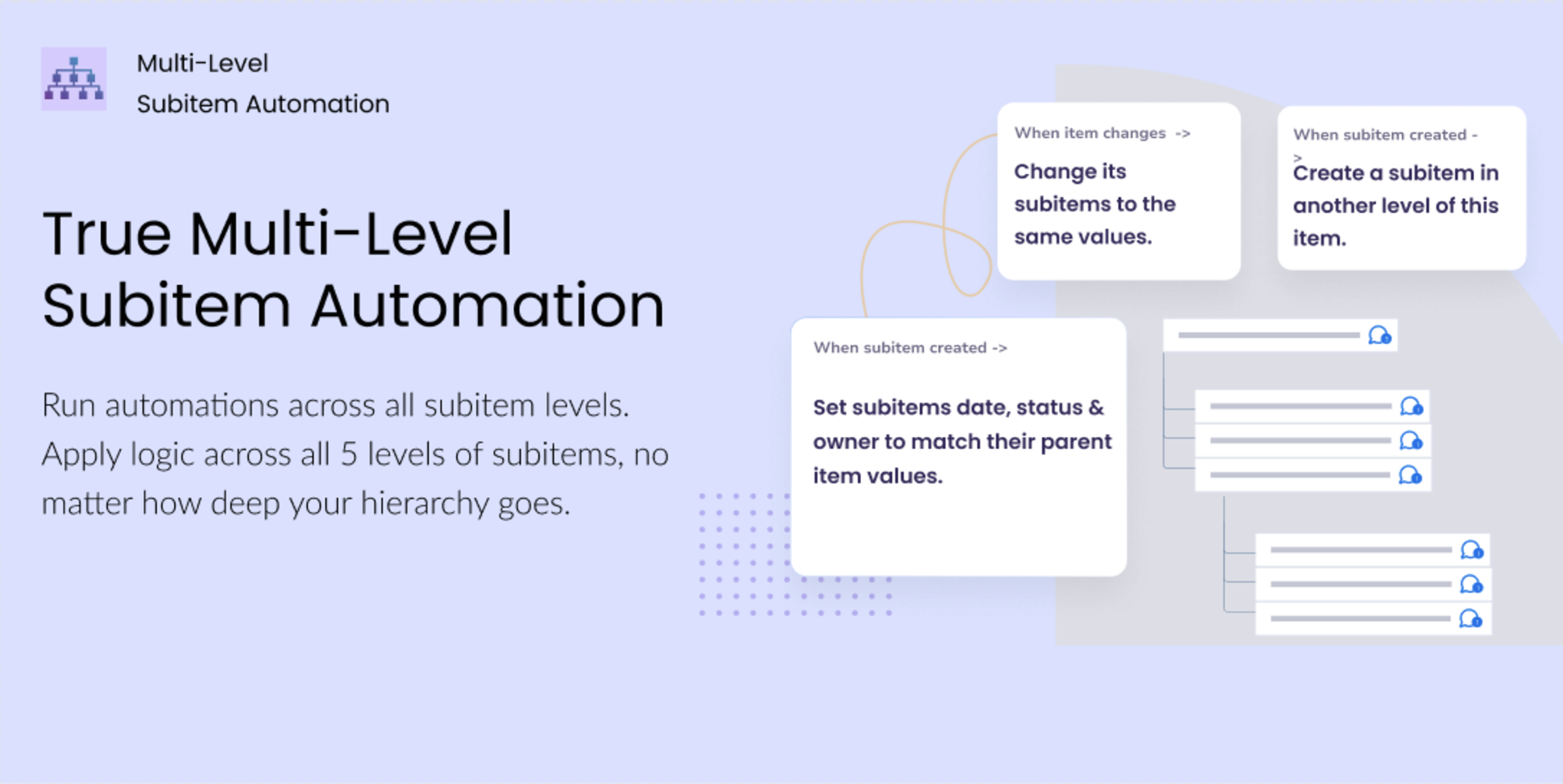 "description": "<p>Multi-Level Subitem Automations is the first solution that empowers you to run automations across all 5 levels of monday.com’s new hierarchy. Solving one of the biggest gaps in monday.com for teams working with complex, multi-layered structures.</p><p><br></p><p>It’s the ultimate app to streamline your work, eliminate manual updates, ensure workflow consistency across every layer, and successfully manage projects, dependencies, naming structures, timelines, and nested work items.</p><p><br></p><p>Built for teams using multiple subitem levels, the app allows you to use pre-configured automations or multi-level triggers to mix and match and build your own custom automation without using external platforms such as Zapier or Make.</p><p><br></p><p>— Main Use Cases & Value —</p><p><br></p><p>Sync values across all hierarchy levels</p><p>Automatically sync parent item values to any newly created subitem — at any level. Works seamlessly up to level 5 and fully respects monday.com’s rollup behavior.</p><p><br></p><p>Advanced Status Logic: </p><p>Automate custom status changes across levels (e.g., if any sub-sub-item is 'Stuck', set the main item to 'At Risk').</p><p><br></p><p>Time-Based Automations: </p><p>Create subitems or change their values based on defined dates in the hierarchy.</p><p><br></p><p>Custom Rollups & Aggregation: </p><p>Aggregate column values across multiple subitem levels to the parent item to easily track progress and use aggregated values in custom automations.</p><p><br></p><p>Multi-Level Dependencies:</p><p>Set dependencies between subitems and items across different board levels to enforce changes and manage work like never before!</p><p><br></p><p>Automate Manual Work: </p><p>Automations to move subitems across items/boards, automatically archive, create new items at any level, and more!</p><p><br></p><p>Enterprise-grade security</p><p>Built on monday.com’s native infrastructure, trusted by thousands of teams for performance and reliability.</p>",