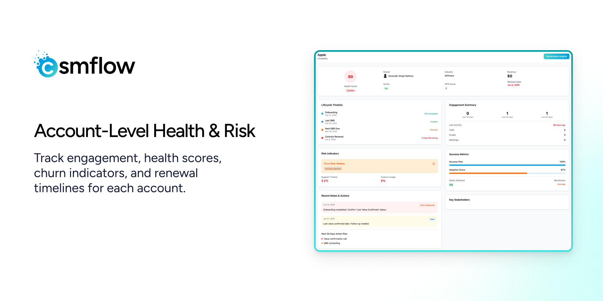 CSMFlow empowers customer success teams to move from reactive firefighting to proactive, insight-driven account management - improving retention, renewals, and long-term customer relationships.