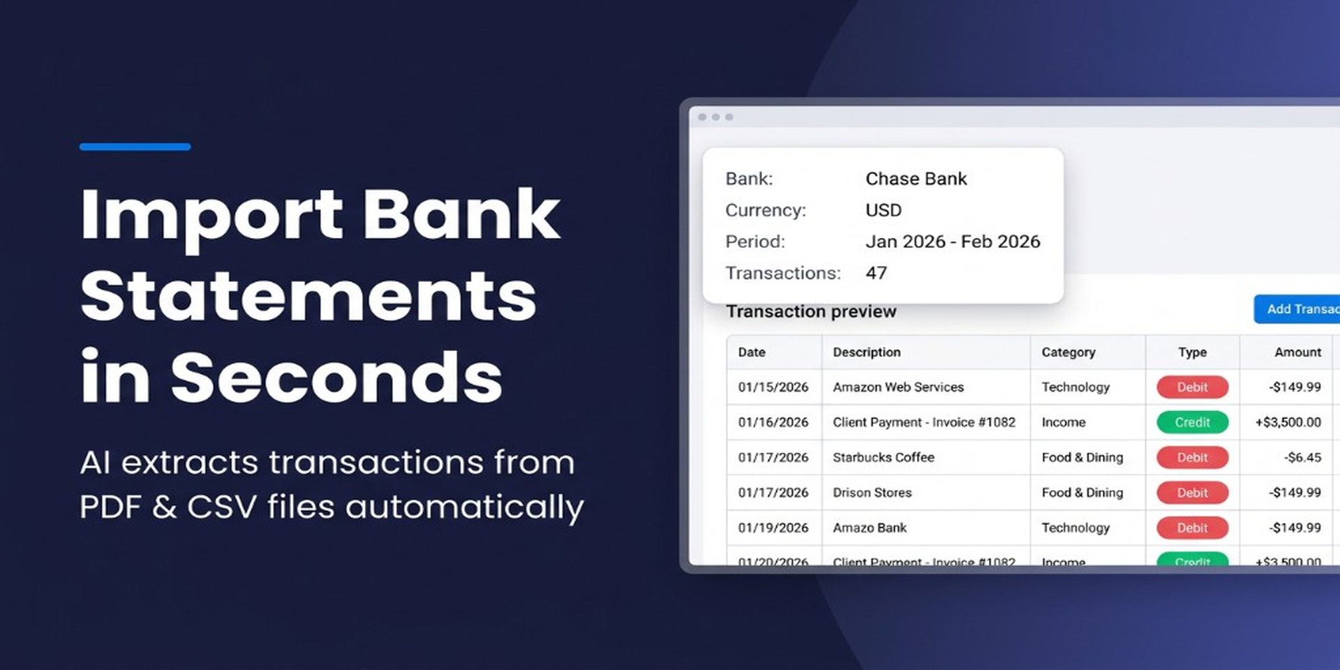 - AI-Powered Extraction — Automatically reads and extracts transactions from PDF and CSV bank statements. No templates, no setup — it works with statements from any bank worldwide.
