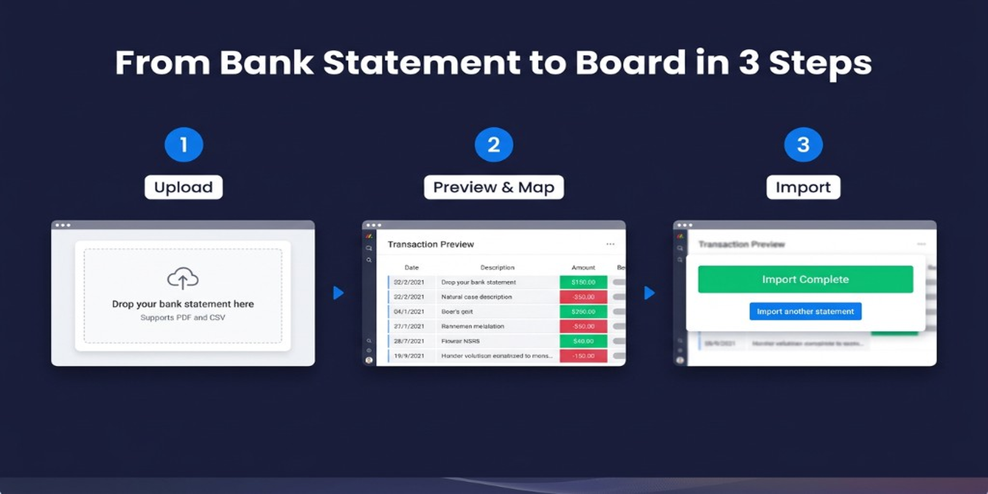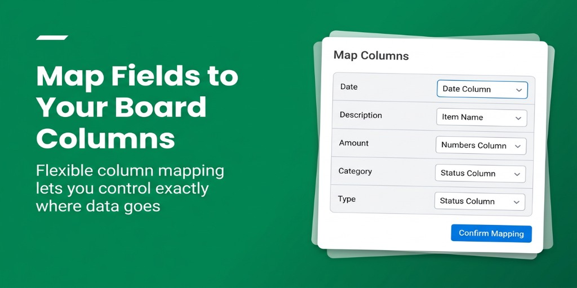 - Smart Column Mapping — Instantly maps extracted data (date, description, amount, balance) to your board's columns. Review and adjust mappings before importing.