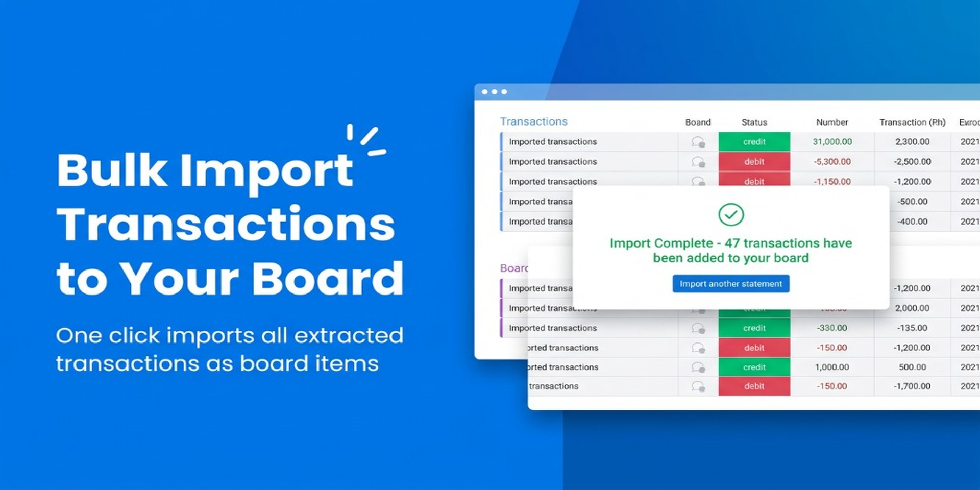 - Bulk Import — Import hundreds of transactions into your monday.com board with a single click. No more copying and pasting row by row.