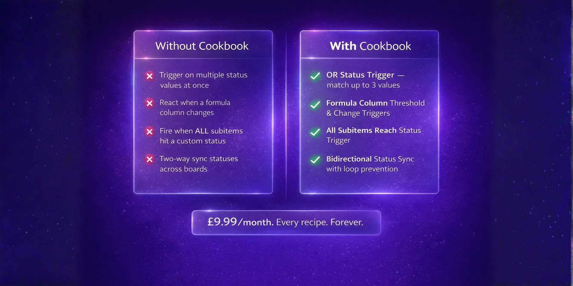 "description": "<p>Community Cookbook for <a href=\"http://monday.com/\" rel=\"noopener noreferrer\" target=\"_blank\">monday.com</a> — Automation Recipe Engine</p><p>The Community Cookbook is a powerful automation engine built for <a href=\"http://monday.com/\" rel=\"noopener noreferrer\" target=\"_blank\">monday.com</a> teams who need more than what native automations offer. Where <a href=\"http://monday.com/\" rel=\"noopener noreferrer\" target=\"_blank\">monday.com</a> stops, this app picks up — giving you a growing library of precision-built recipe blocks that handle the edge cases, column types, and cross-board logic that everyday work actually demands.</p><p>Whether you're syncing people columns across items, rolling up subitem data into a parent, calculating and writing number results on the fly, copying values at the exact moment a status changes, or firing triggers when a checkbox is ticked or a dropdown shifts — every block is purpose-built to do one thing and do it cleanly.</p><p>What's inside:</p><p>20+ actions across columns, numbers, dates, logic, status, and subitems</p><p>9 triggers including checkbox changes, dropdown changes, formula thresholds, subitem events, connected item status, and OR-status conditions</p><p>Smart webhook management — webhooks are scoped to exactly the column being watched, keeping your board fast and your event noise low</p><p>Subitem toolkit — archive, delete, change statuses, copy parent values down, copy people across boards</p><p>Number engine — increment, decrement, calculate, compare, and write results back automatically</p><p>Built by the community, for the community.</p><p>Every recipe in this app started as a real problem someone had. Got a workflow gap that <a href=\"http://monday.com/\" rel=\"noopener noreferrer\" target=\"_blank\">monday.com</a>'s native automations can't solve? Submit your idea and it could become the next block in the cookbook.</p><p>👉 Submit your idea: <a href=\"http://communitycookbookmonday.com/ideas\" rel=\"noopener noreferrer\" target=\"_blank\">communitycookbookmonday.com/ideas</a></p><p>The cookbook grows with every contribution. Join the community, share your automation challenges, and help shape what gets built next.</p>",