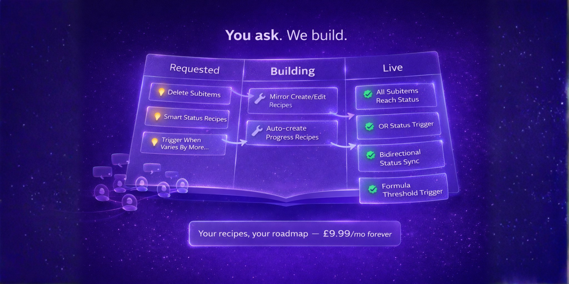 Every recipe in this app started as a real problem someone had. Got a workflow gap that monday.com's native automations can't solve? Submit your idea and it could become the next block in the cookbook.