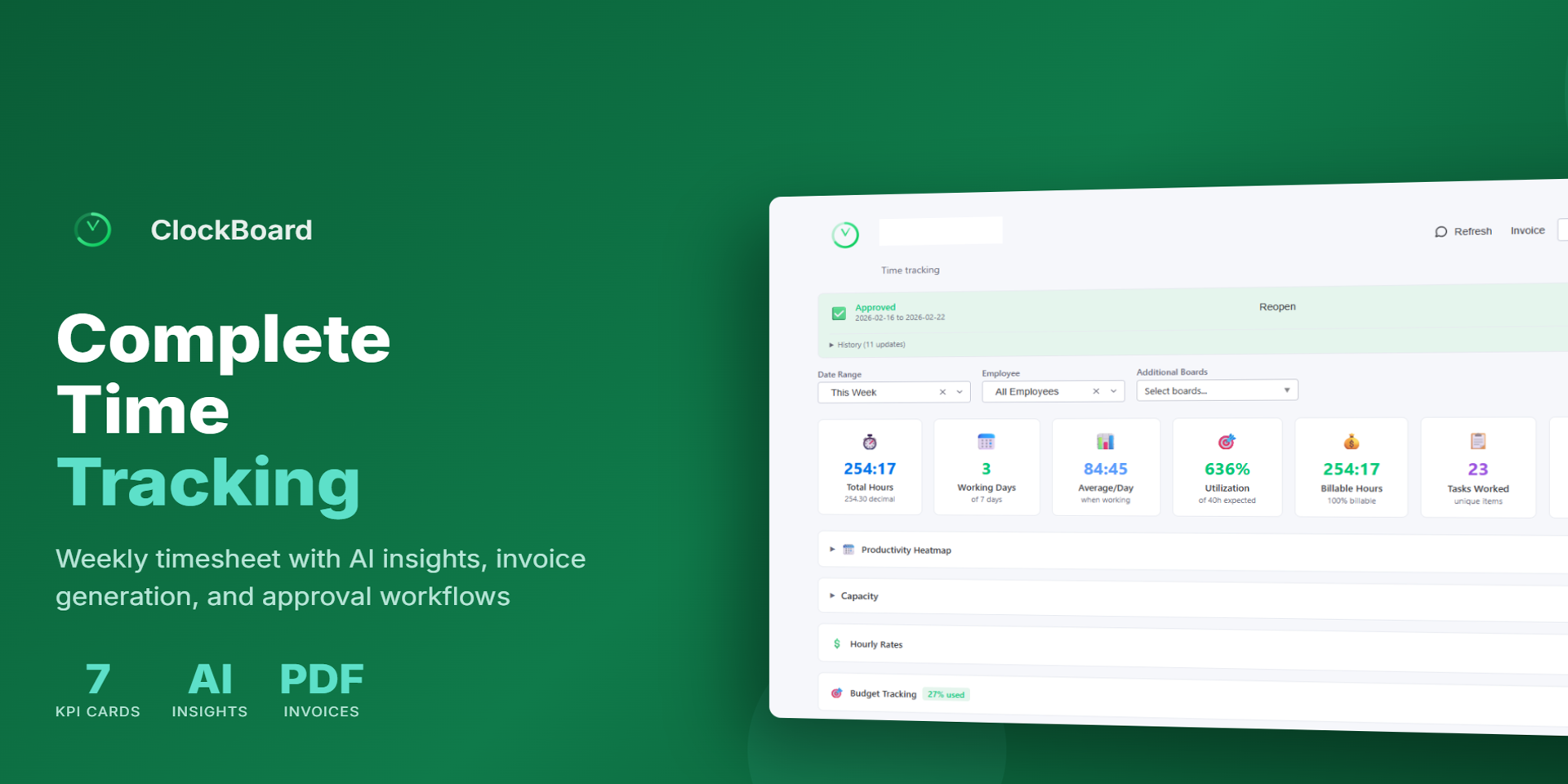Professional timesheets with KPIs, invoices, and AI insights
