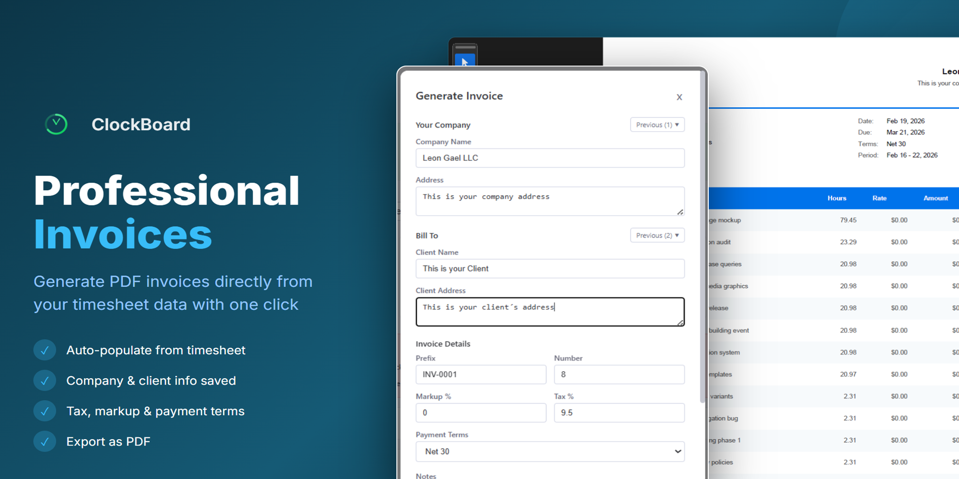 Professional PDF Invoices — Generate invoices directly from your timesheet data. Auto-populate line items, add tax, markup, and payment terms