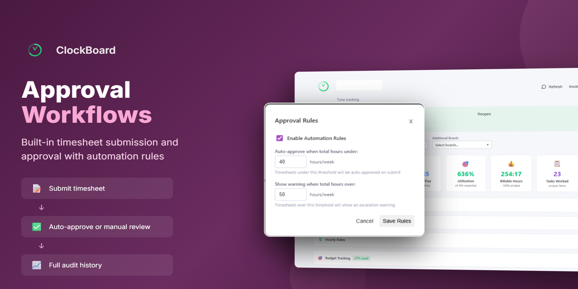 Approval Workflows — Submit timesheets for review with automation rules for auto-approval. Full audit history included