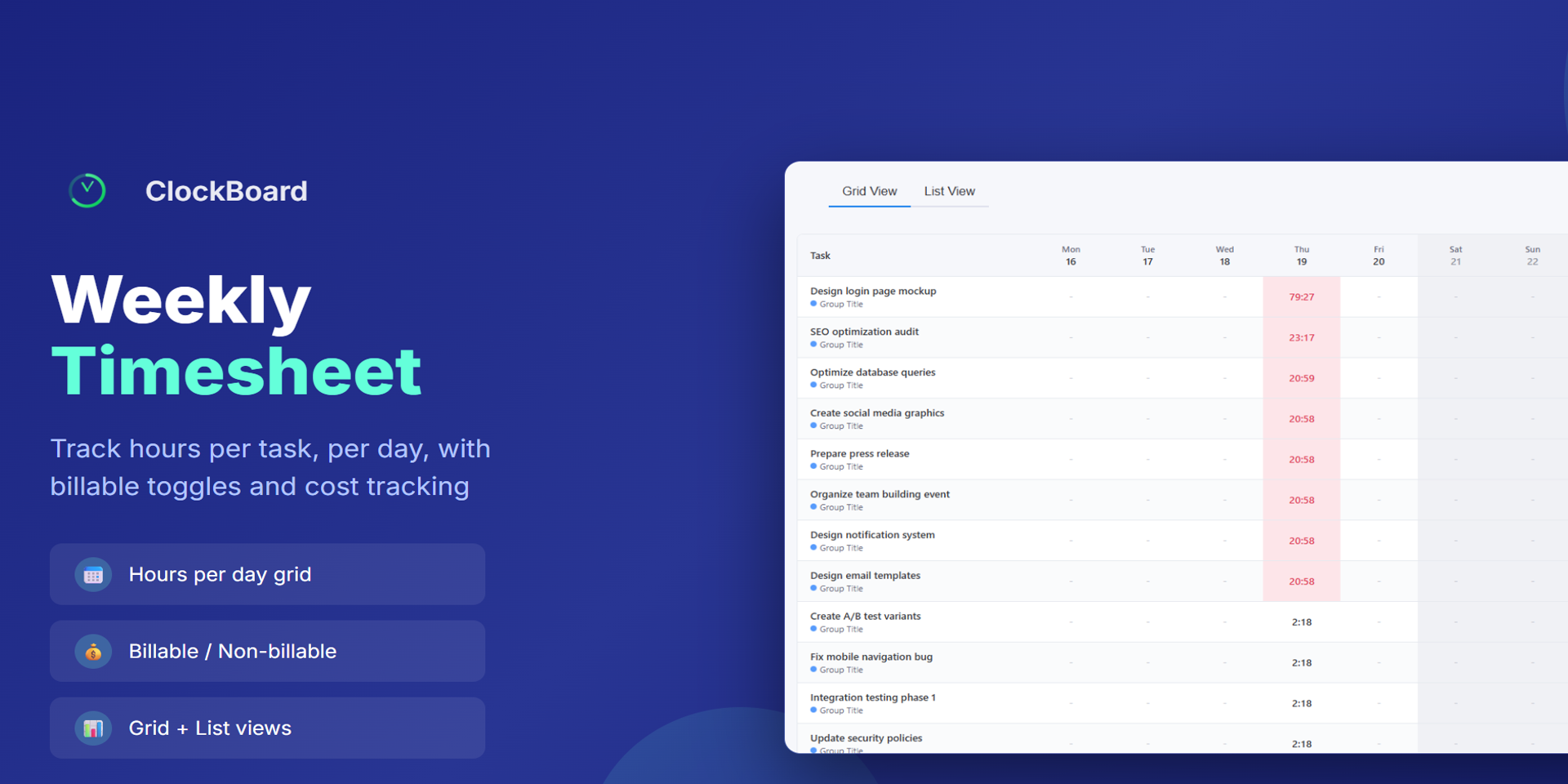 Weekly Timesheet Grid — Log hours per task, per day, with billable/non-billable toggles and cost tracking. Switch between Grid and List views