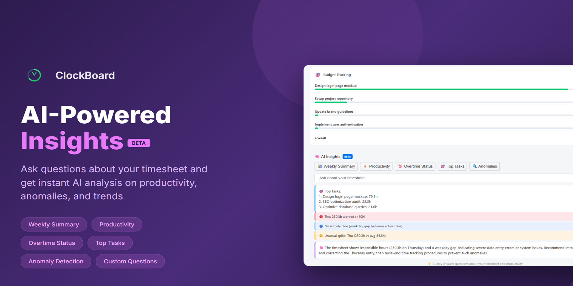 AI-Powered Insights (Beta) — Ask questions about your timesheet and get instant analysis on productivity, anomalies, and trends. Powered by DeepSeek AI