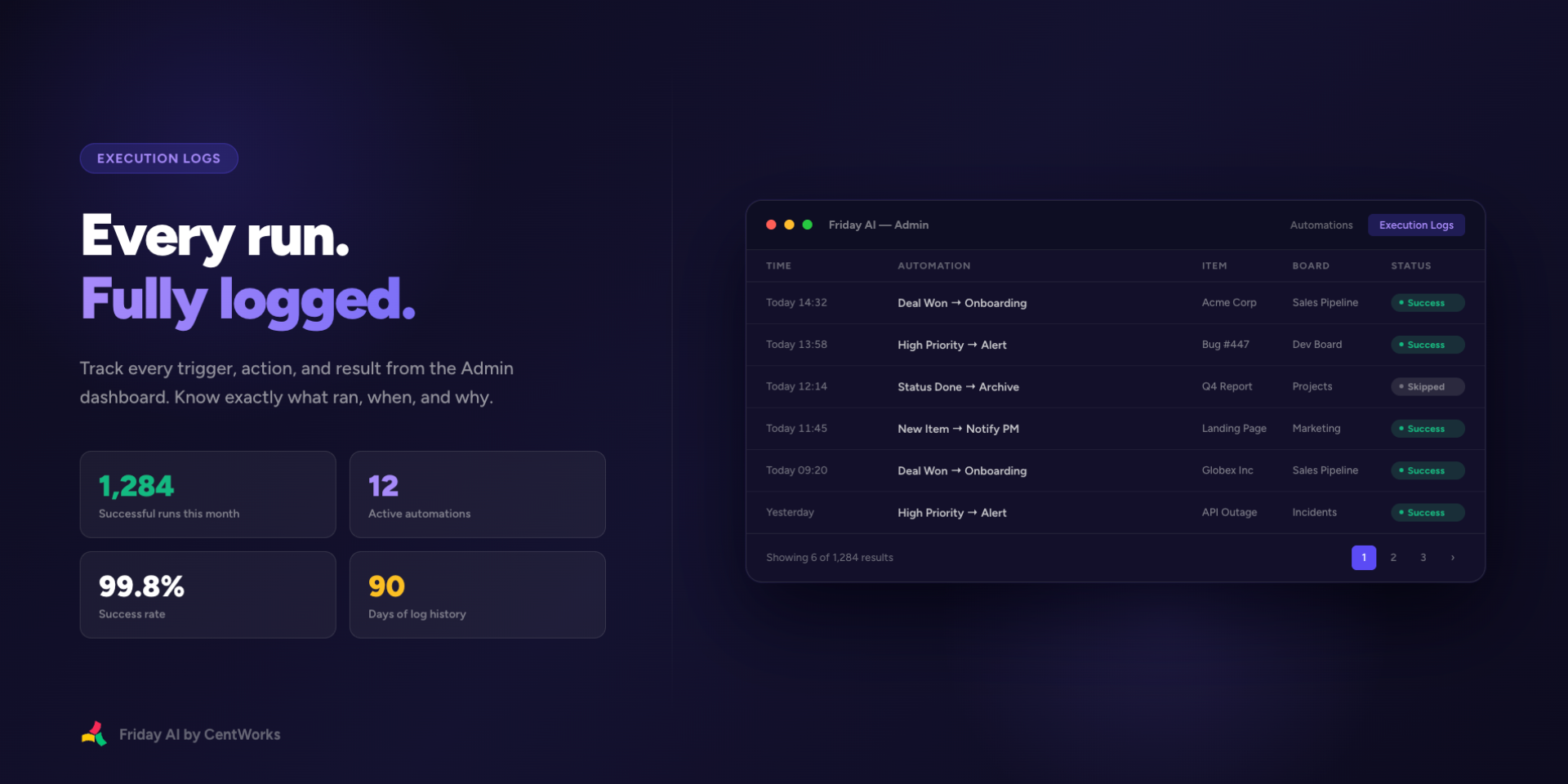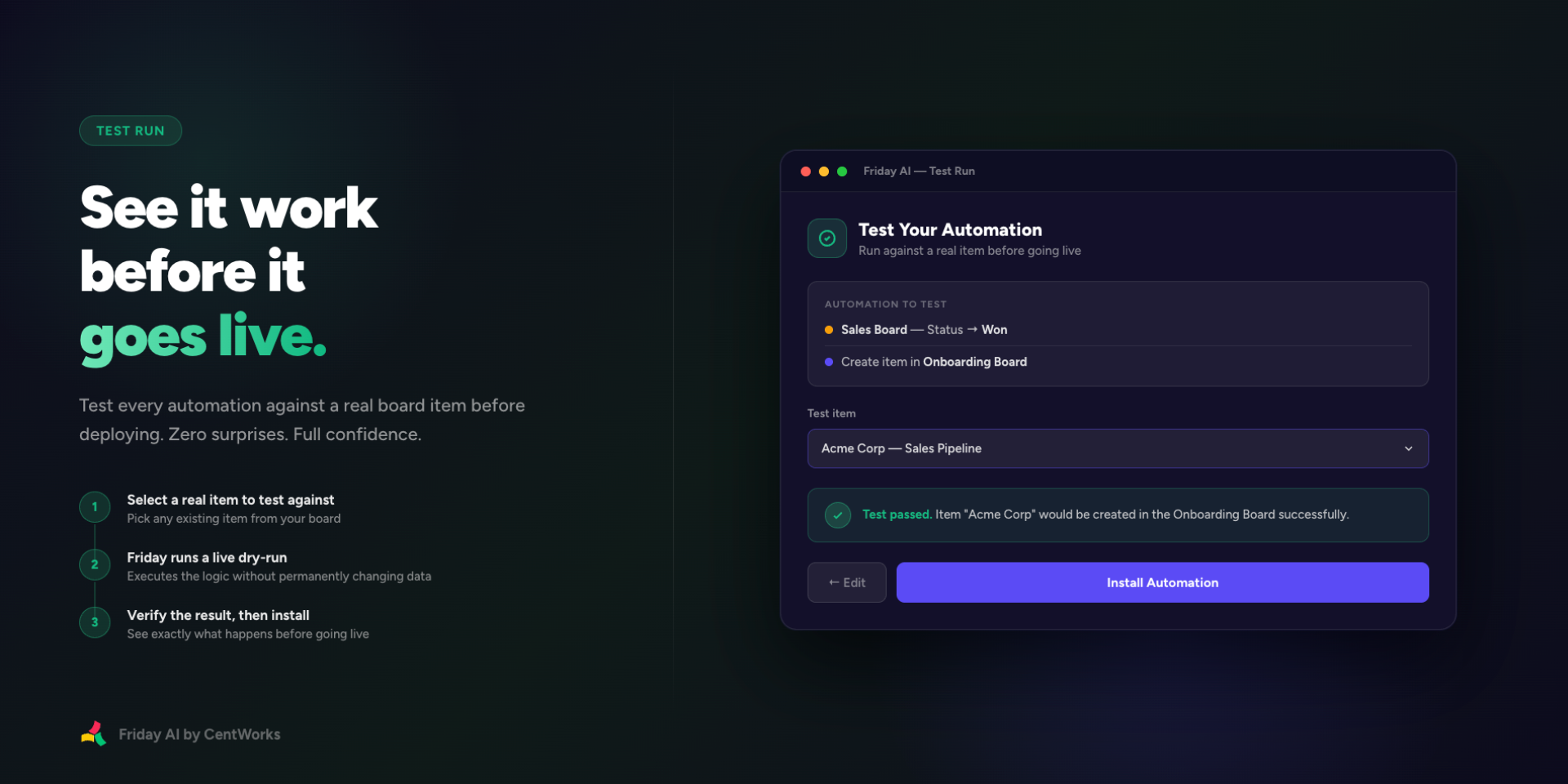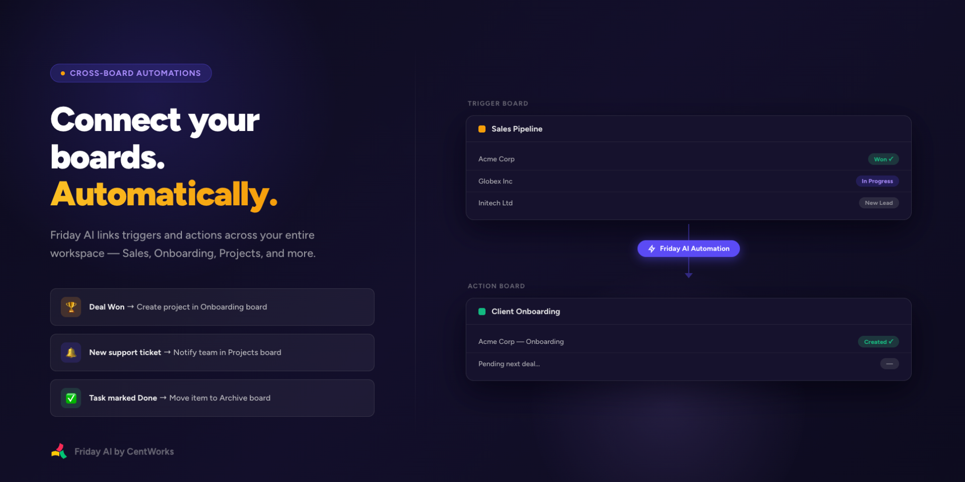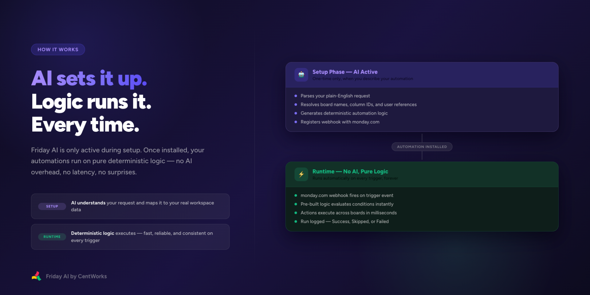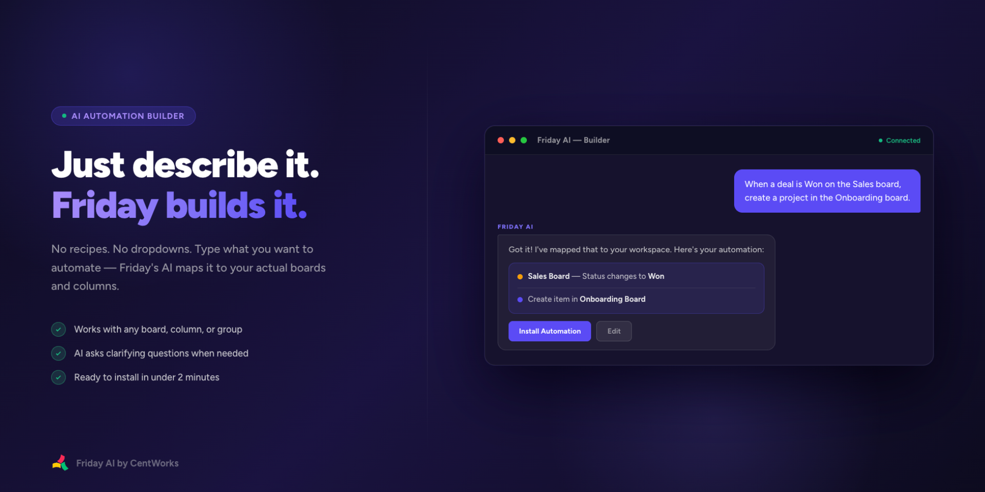 "description": "<p>Friday AI lets monday.com users create powerful automations by simply describing what they want in plain English no templates, no code, no technical setup. Built for operations teams and project managers who want their boards to work smarter without complex configuration.</p><p><br></p><p>What problems do we solve?</p><p>- Teams waste hours on repetitive manual actions — moving items, updating statuses, notifying teammates</p><p>- Native monday.com automations aren't flexible enough for complex, multi-step or cross-board workflows</p><p>- Building automations is too technical for most users — Friday AI removes that barrier entirely</p><p>- When automations fail silently, debugging is painful — Friday AI logs every run and diagnoses issues automatically</p><p><br></p><p>What you get:</p><p>- Build automations through a simple chat — just describe what you want, AI handles the rest</p><p>- Every automation is verified before going live — you stay in control at every step</p><p>- Real-time webhook execution — automations fire the instant your trigger conditions are met</p><p>- Full execution logs for every run with trace IDs and error details</p><p>- AI-powered diagnostics automatically investigate failures and suggest fixes</p><p><br></p><p>Example use cases:</p><p>- Move items when status changes, notify owners, sync columns across boards</p><p>- Delete or archive completed items automatically</p><p>- Act on a parent item only when all subitems reach a certain status</p><p>- Chain multiple actions from a single trigger</p><p><br></p><p>AI Model: Friday AI uses Claude Sonnet 4.6 by Anthropic during setup only never at execution time. Every live run is fully deterministic and predictable.</p><p><br></p><p>📅 Book a Demo: <a href=\"www.centworks.io/index.html#contact\" rel=\"noopener noreferrer\" target=\"_blank\">www.centworks.io/index.html#contact</a></p><p><br></p><p>About Centworks: We build AI-powered products on monday.com that make automation accessible to every team not just engineers.</p>",