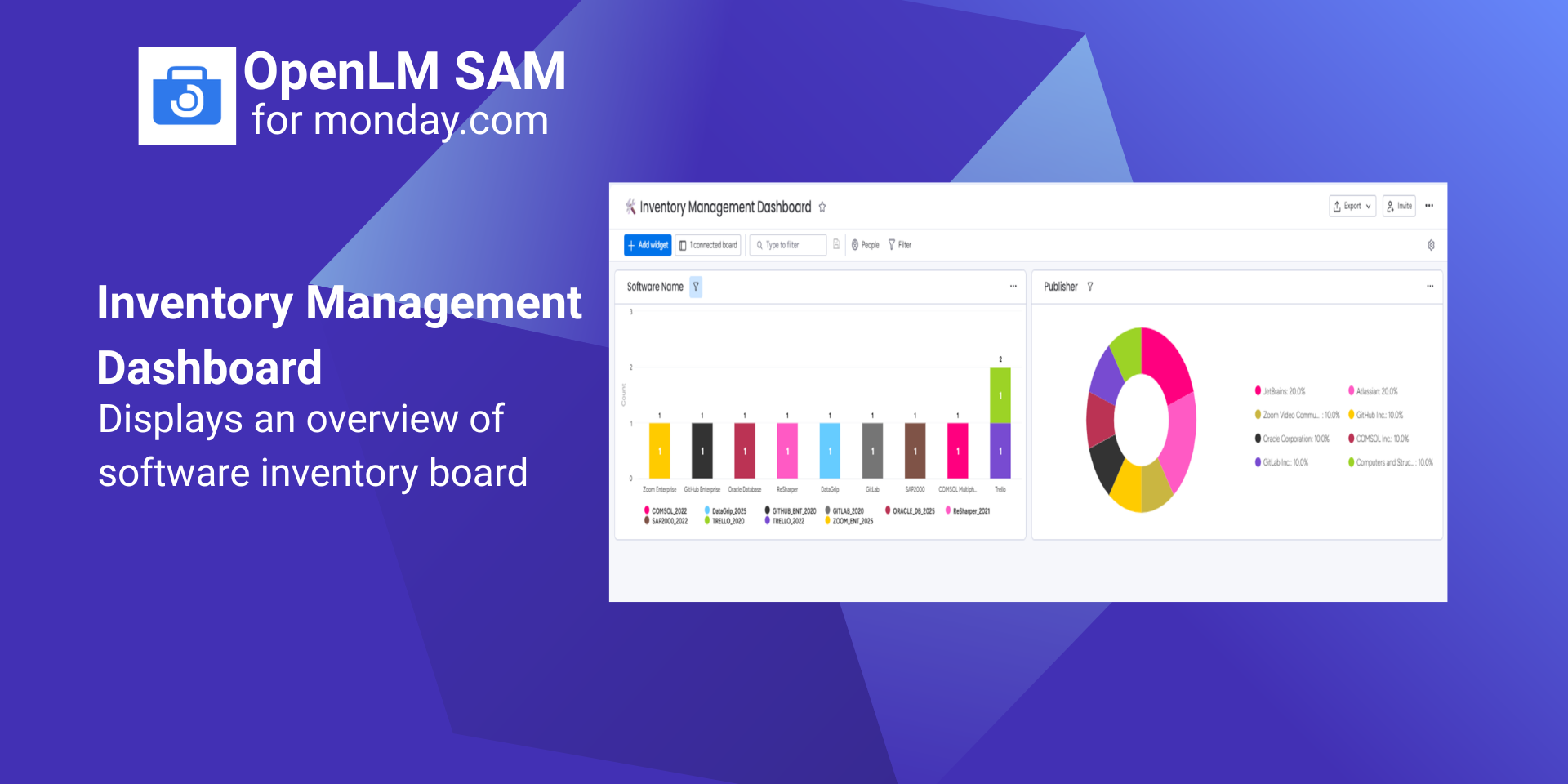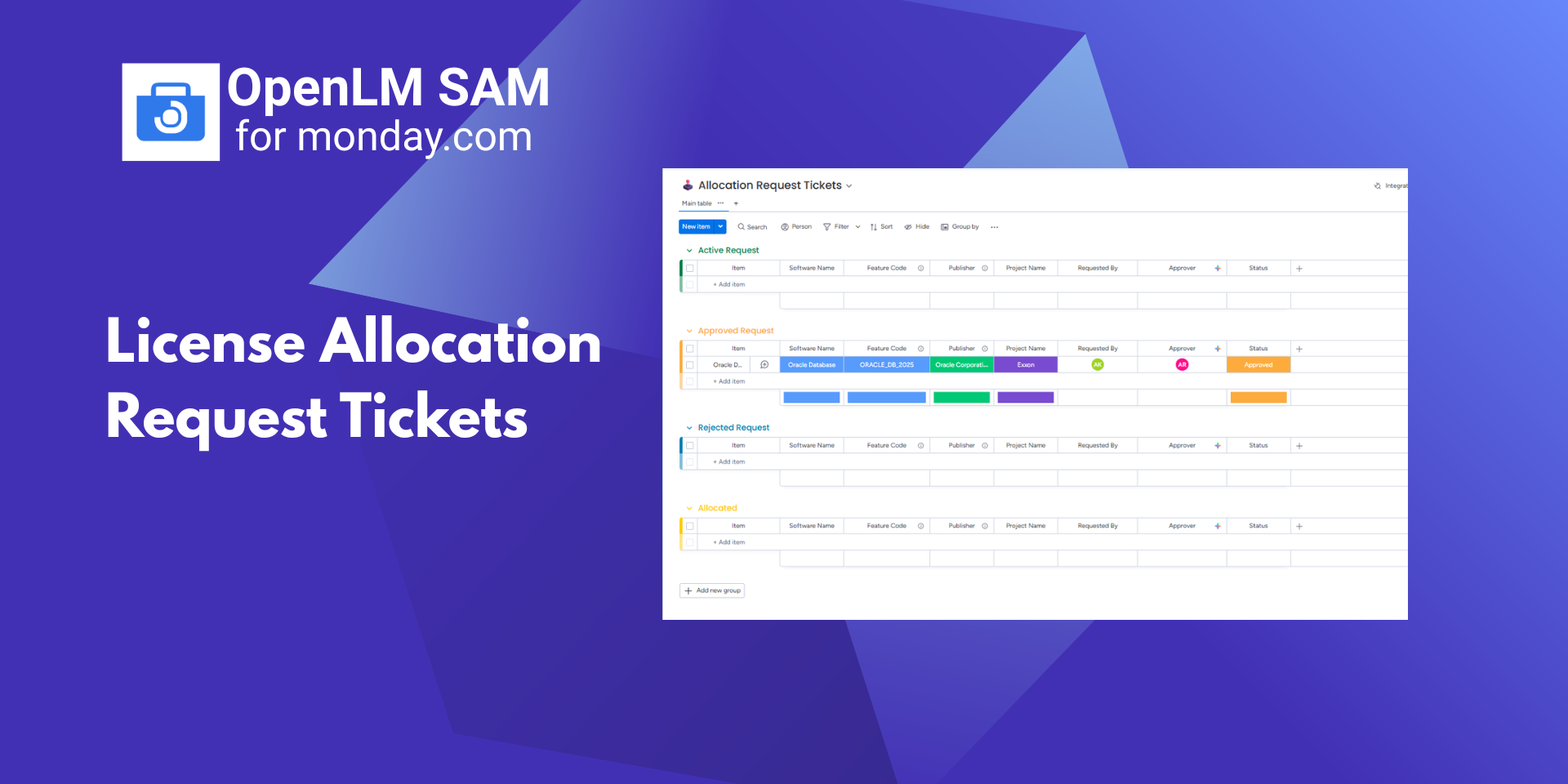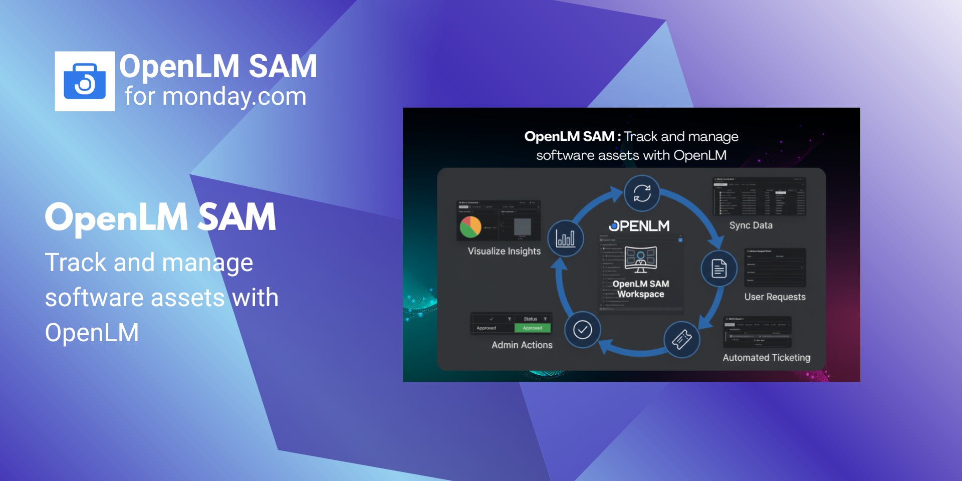 "description": "<p>OpenLM SAM is a Software Asset Management solution that helps organizations centrally track, allocate, and manage software licenses directly inside monday.com. It provides visibility into license catalog & inventory, allocation and procurement workflows, and system alerts—helping IT teams manage software assets more efficiently from a single workspace.</p><p><br></p><p><br></p><p>What you get with OpenLM SAM:</p><p>📦Pre-built Workspace (Ready on Install)</p><p>Automatically creates forms, boards, dashboards, automations, and integrations for software asset management.</p><p><br></p><p>🧭Guided Onboarding & Secure Data Sync</p><p>OpenLM onboarding page in monday.com</p><p>Authorize via OpenLM SAM UI</p><p>Configure app using a folder/template ID</p><p>Synchronize Software Catalog and License Inventory from OpenLM to monday</p><p><br></p><p>📚Software Catalog & Inventory Boards</p><p>Software Catalog Board lists applications</p><p>License Inventory Board tracks available licenses</p><p><br></p><p>📝License Allocation</p><p>Employees submit requests via Allocation Form</p><p>Requests automatically appear in the Allocations Tickets</p><p>Once IT Admins review & Allocate current Inventory gets updated automatically and employees receive email notifications</p><p><br></p><p>🛒License Procurement</p><p>IT Admin submits Procurement Form</p><p>Tickets appear in the Procurement Tickets</p><p>After purchase by CAD/CAM Manager, inventory is updated with IT Admins email notifications</p><p><br></p><p>🚨Alerts Management</p><p>OpenLM alerts flow into Alerts Board & Default assignees are automatically notified </p><p>Managed using Working on it, Stuck, Resolved</p><p>Alerts Dashboard shows source and status overview</p><p><br></p><p>👥Projects & Employees</p><p>Track licenses by employee and project.</p><p><br></p><p>📊Dashboards</p><p>Inventory, Allocated Licenses, and Alerts dashboards provide centralized visibility.</p><p><br></p><p>Benefits for your team:</p><p>✅Centralized license inventory</p><p>✅Structured allocation and procurement workflows</p><p>✅Real-time alert visibility</p><p>✅Employee & project-level license tracking</p><p>✅Dashboard-driven insights</p><p><br></p><p>👉Book a demo:<a href=\"https://calendar.app.google/LHSi92zydnp9jxdU6\" rel=\"noopener noreferrer\" target=\"_blank\">https://calendar.app.google/LHSi92zydnp9jxdU6</a></p>",