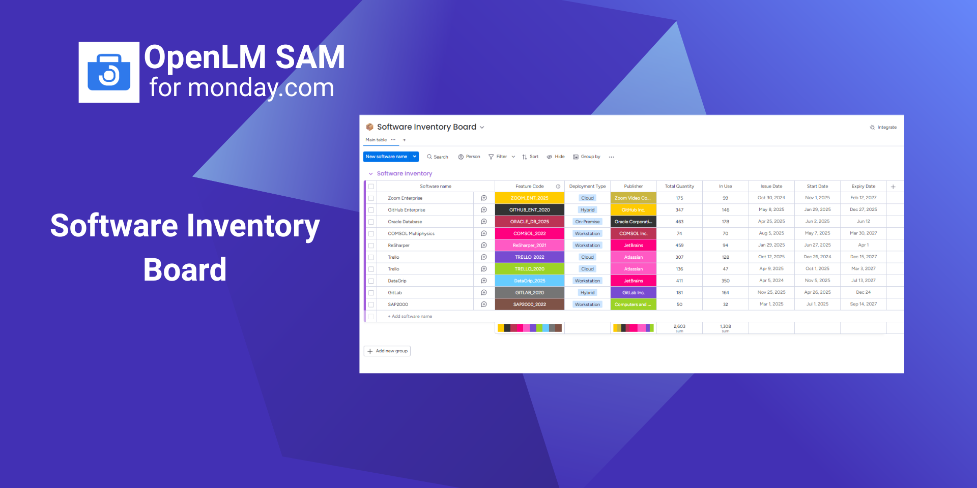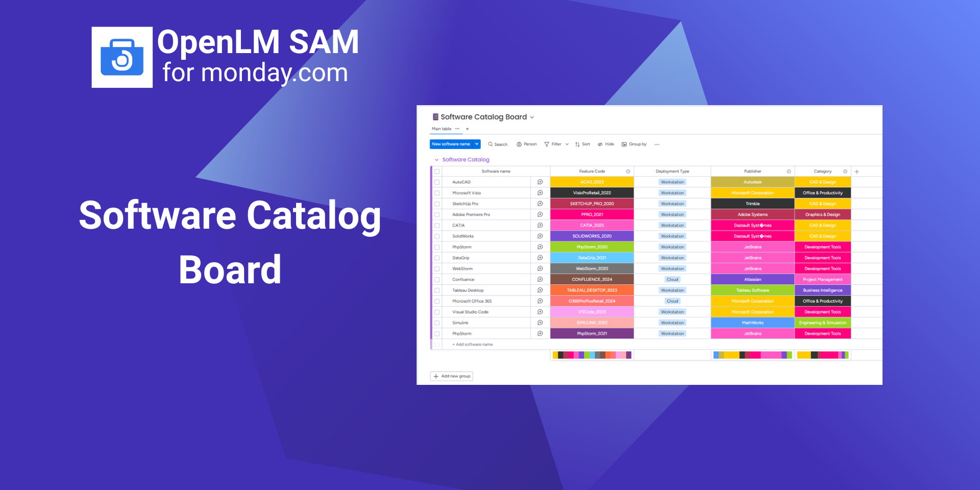 Track and manage software assets with OpenLM SAM. OpenLM SAM is a Software Asset Management solution that helps organizations centrally track, allocate, and manage software licenses directly inside monday.com. It provides visibility into license catalog & inventory, allocation and procurement workflows, and system alerts—helping IT teams manage software assets more efficiently from a single workspace.