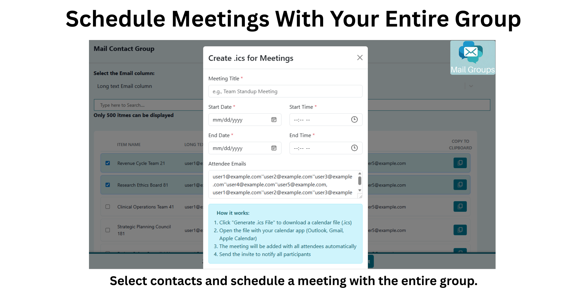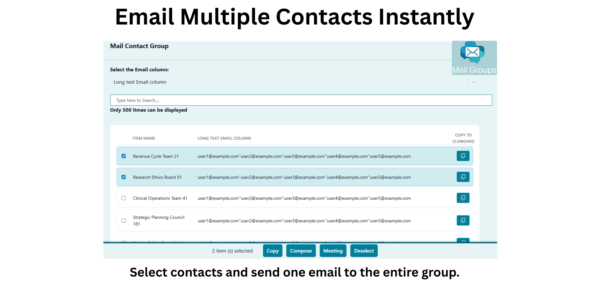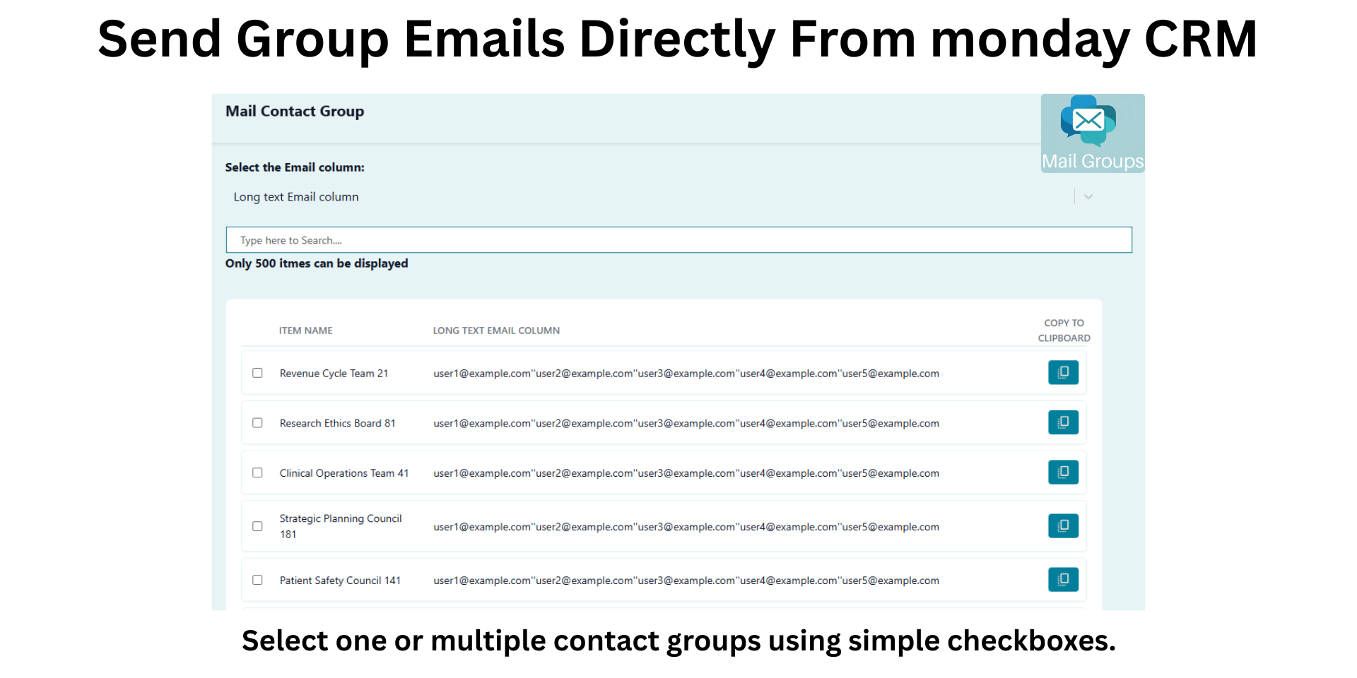 "description": "<p><strong>Send group emails directly from monday CRM — no exports, no copy-paste.</strong></p><p>If you’ve ever tried emailing a group of contacts from monday CRM, you’ve probably run into this:</p><p>→ Emails are sent individually</p><p>→ No way to include all recipients in one message</p><p>→ Teams export reports or copy emails manually. It works… but it slows everything down.</p><p><strong>Mail Groups fixes that.</strong></p><p>Select contacts directly from your monday board and send one email to the entire group — without leaving monday. No downloads. No switching tools. No manual steps.</p><p><strong>What You Can Do</strong></p><p><strong>• </strong>Send one email to multiple contacts as a group</p><p>• Search contacts instantly by name, email, or group</p><p>• Select contacts across filtered results</p><p>• Copy email lists to clipboard in one click</p><p>• Generate meeting invitations (.ics) for selected contacts</p><p>• Works with multiple email column types (Email, Text, Long Text, Mirror)</p><p>• Matches monday Light, Dark, and Night themes automatically</p><p><strong>Why Teams Use Mail Groups</strong></p><p>⚡ Eliminate manual export and copy-paste workflows</p><p>⚡ Communicate with stakeholders in a single thread</p><p>⚡ Save time during outreach and coordination</p><p>⚡ Keep all communication workflows inside monday</p><p><strong>How It Works</strong></p><p>Add Mail Groups as a board view</p><p>Select your email column</p><p>Choose contacts</p><p>Send or copy emails instantly</p><p><strong>Built for Teams Managing</strong></p><p>• Client relationships</p><p>• Partner networks</p><p>• Stakeholder communications</p><p>• Event outreach and coordination</p><p><strong>Seamless monday Experience</strong></p><p>Mail Groups is designed to feel native to monday — fast, simple, and aligned with your existing workflows.</p><p>🔐<strong> Privacy & Security</strong></p><p>Mail Groups uses the monday SDK and API to access data securely. No data is stored outside of <a href=\"http://monday.com/\" rel=\"noopener noreferrer\" target=\"_blank\">monday.com</a>.</p>",