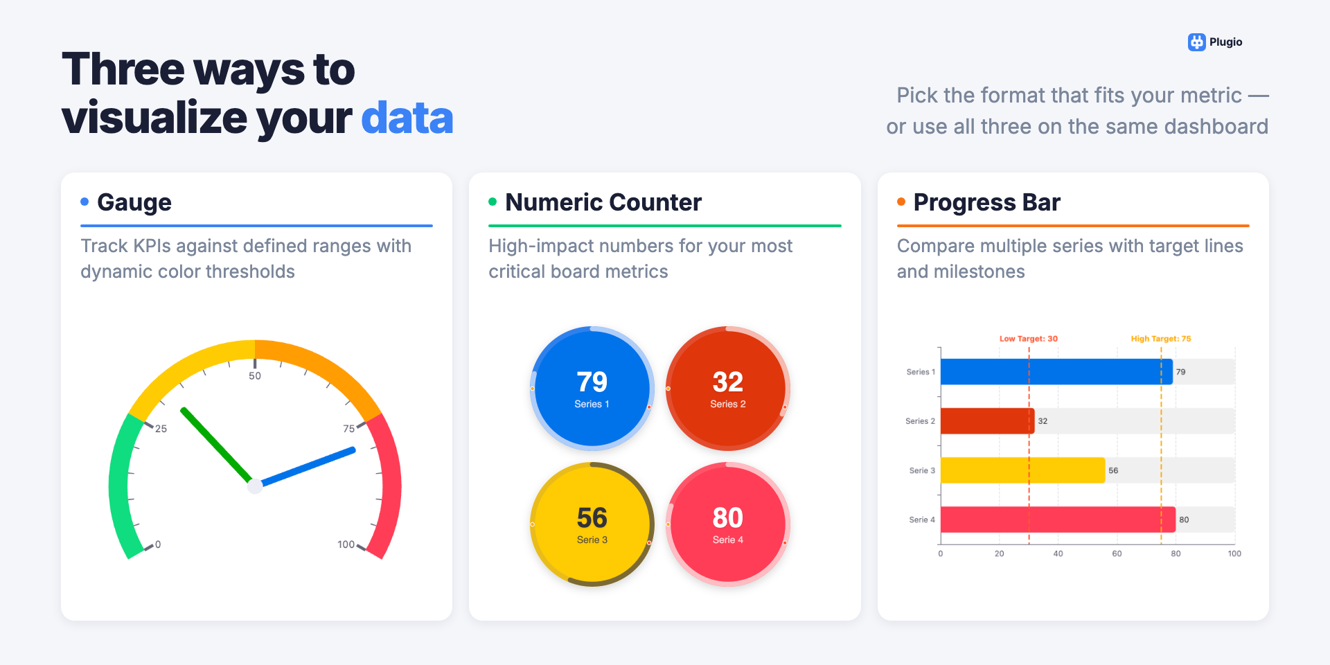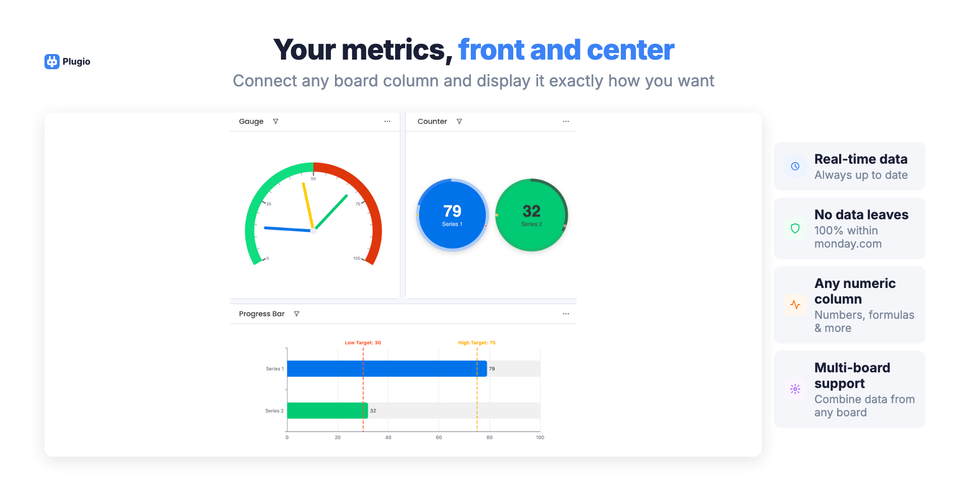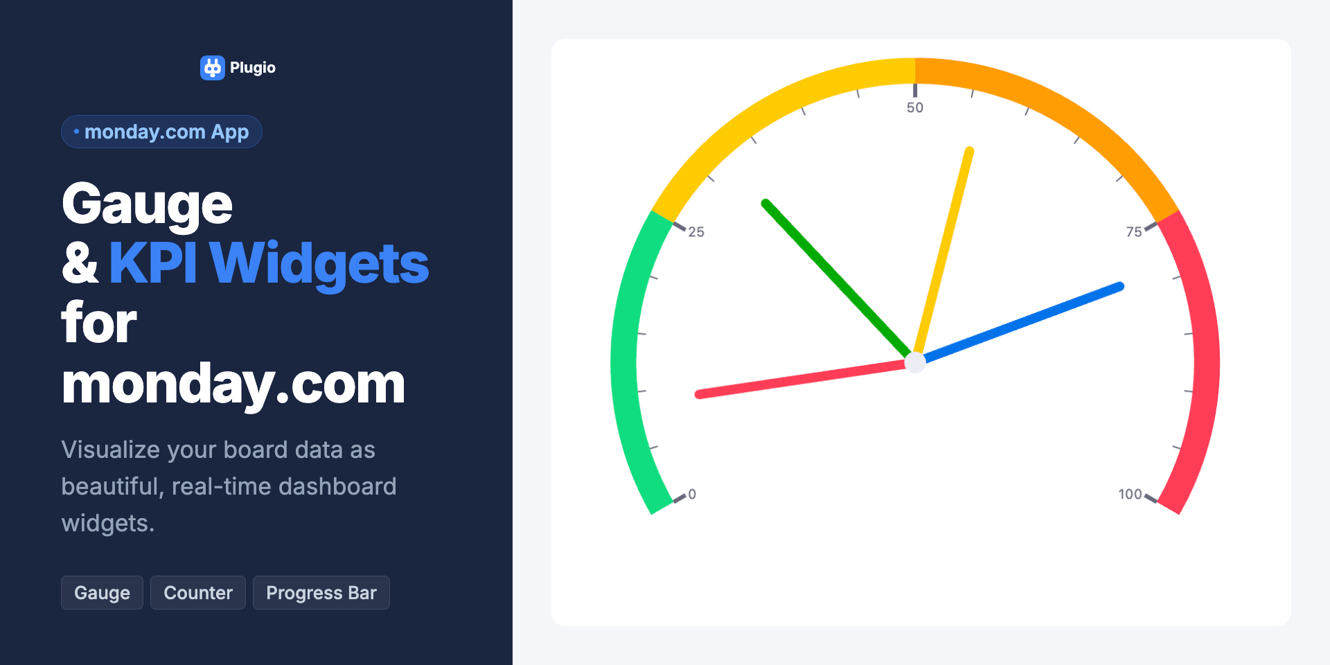 Plugio Gauge & KPI Widgets brings powerful data visualization directly to your monday.com dashboards — no external tools, no exports, no complexity. Built for teams who need clear, real-time metrics without ever leaving monday.com.