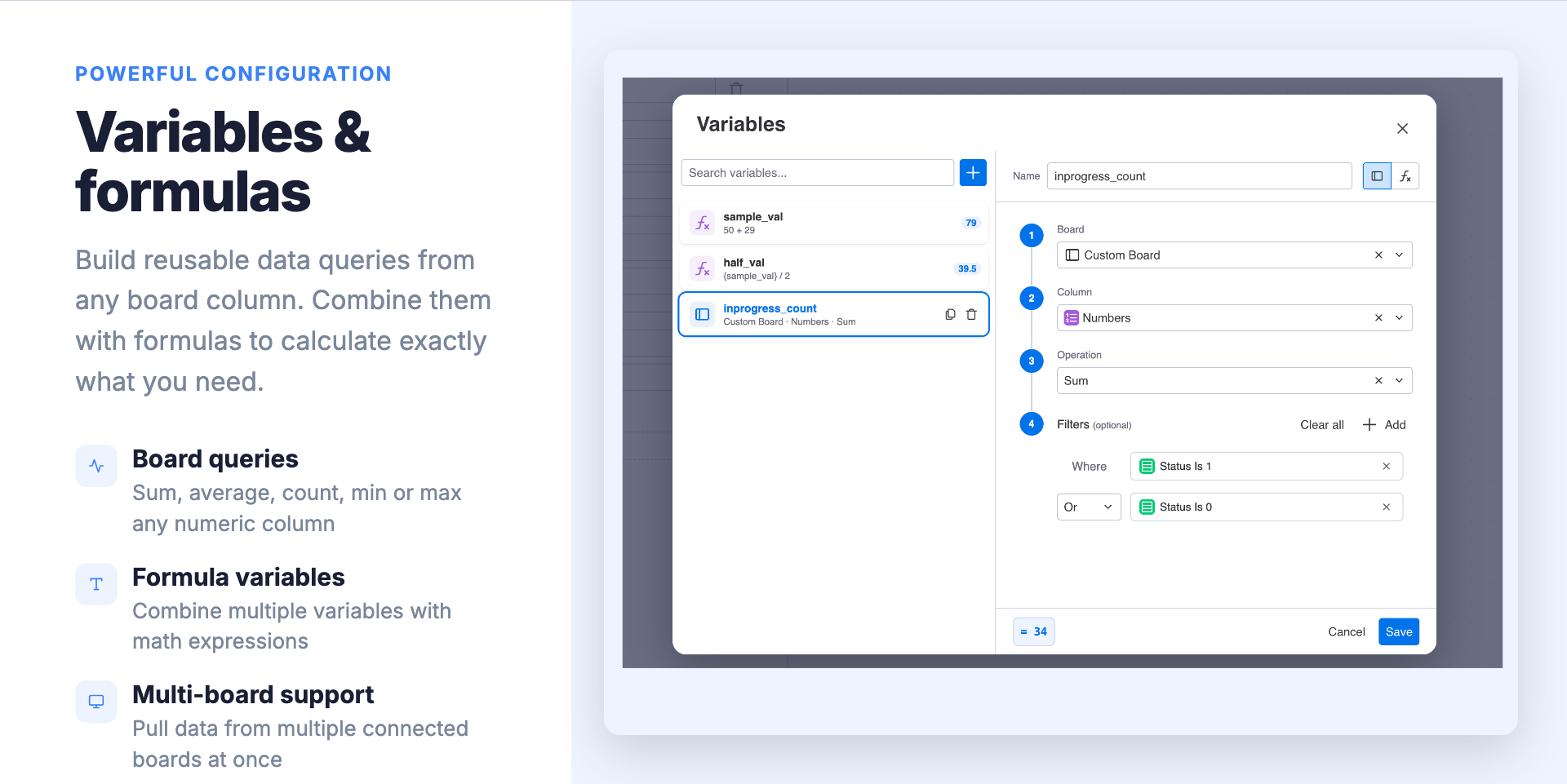 Variables & Formulas — Build reusable data queries (sum, average, count, min, max) and combine them into calculated metrics