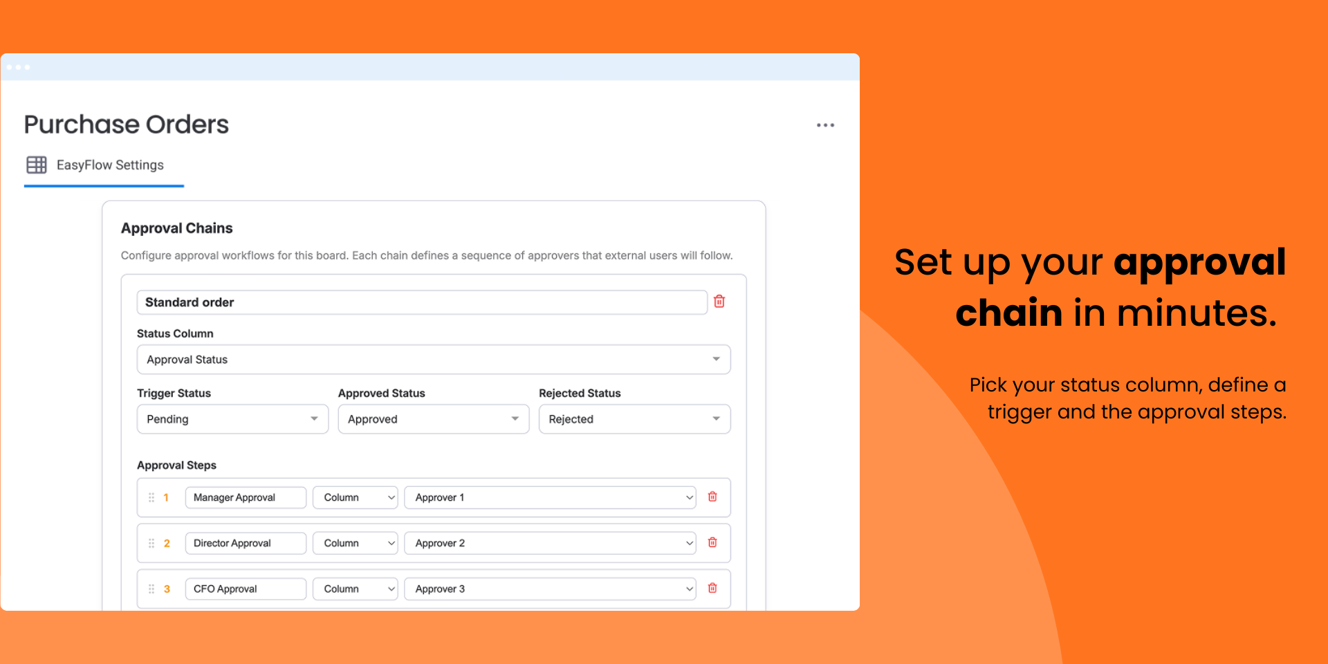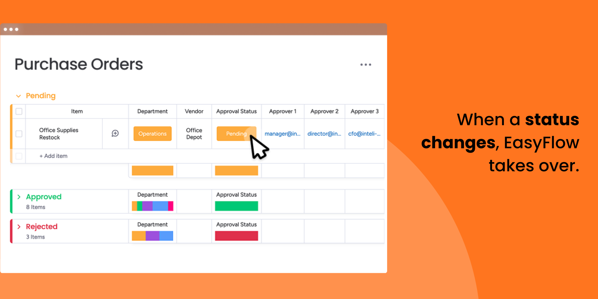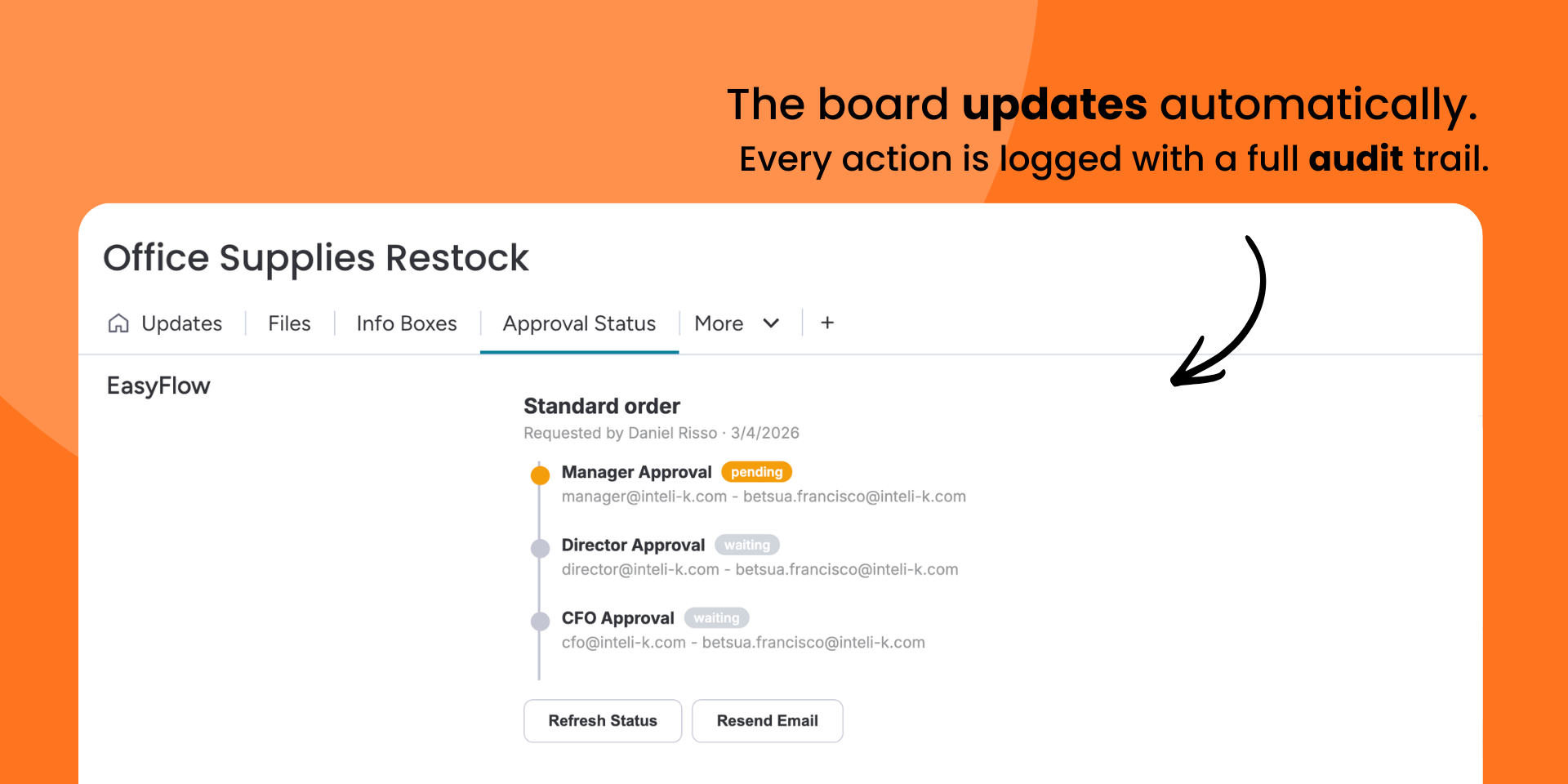Automate multi-step approval workflows with email actions EasyFlow automates multi-step approval workflows directly inside monday.com . Built for teams managing purchase orders, hiring decisions, content sign-offs, contracts, or any process that needs structured authorization — without leaving your board.