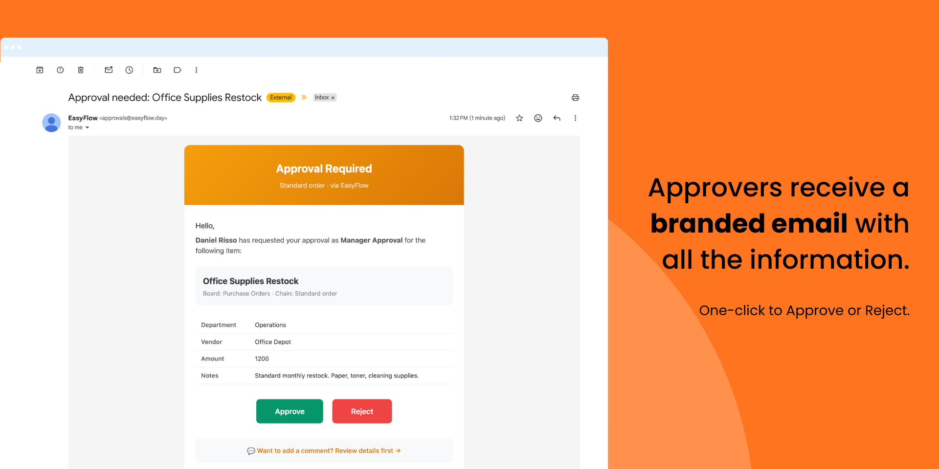 One-click email approvals — Approvers receive a branded email with item context (name, amount, vendor, notes) and Approve or Reject buttons. No monday.com account required. No login. One click.