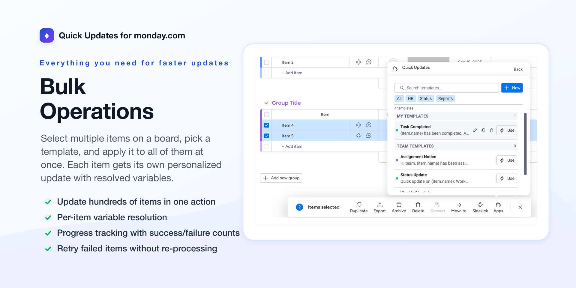 Quick Updates helps monday.com teams stop typing the same Updates over and over. Create reusable update templates, personalize them with live item and board data, and post consistent updates to one item or many selected items in just a few clicks.