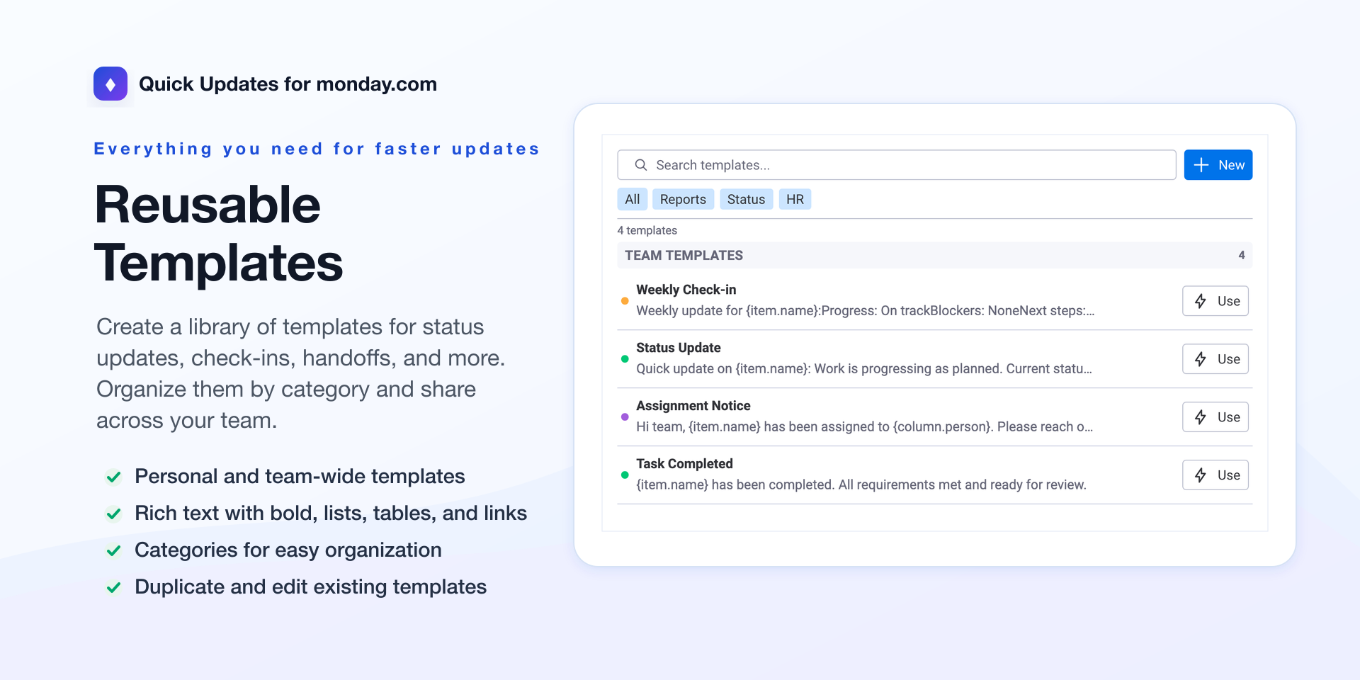 - Create reusable update templates for status reports, handoffs, reminders, onboarding notes, follow-ups, and more.
