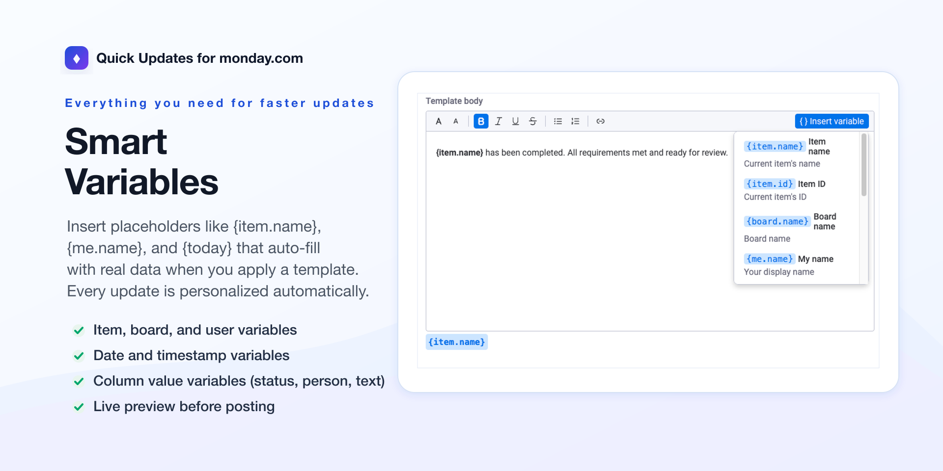 - Personalize every message automatically with variables like {item.name}, {board.name}, {me.name}, {today}, and column values.