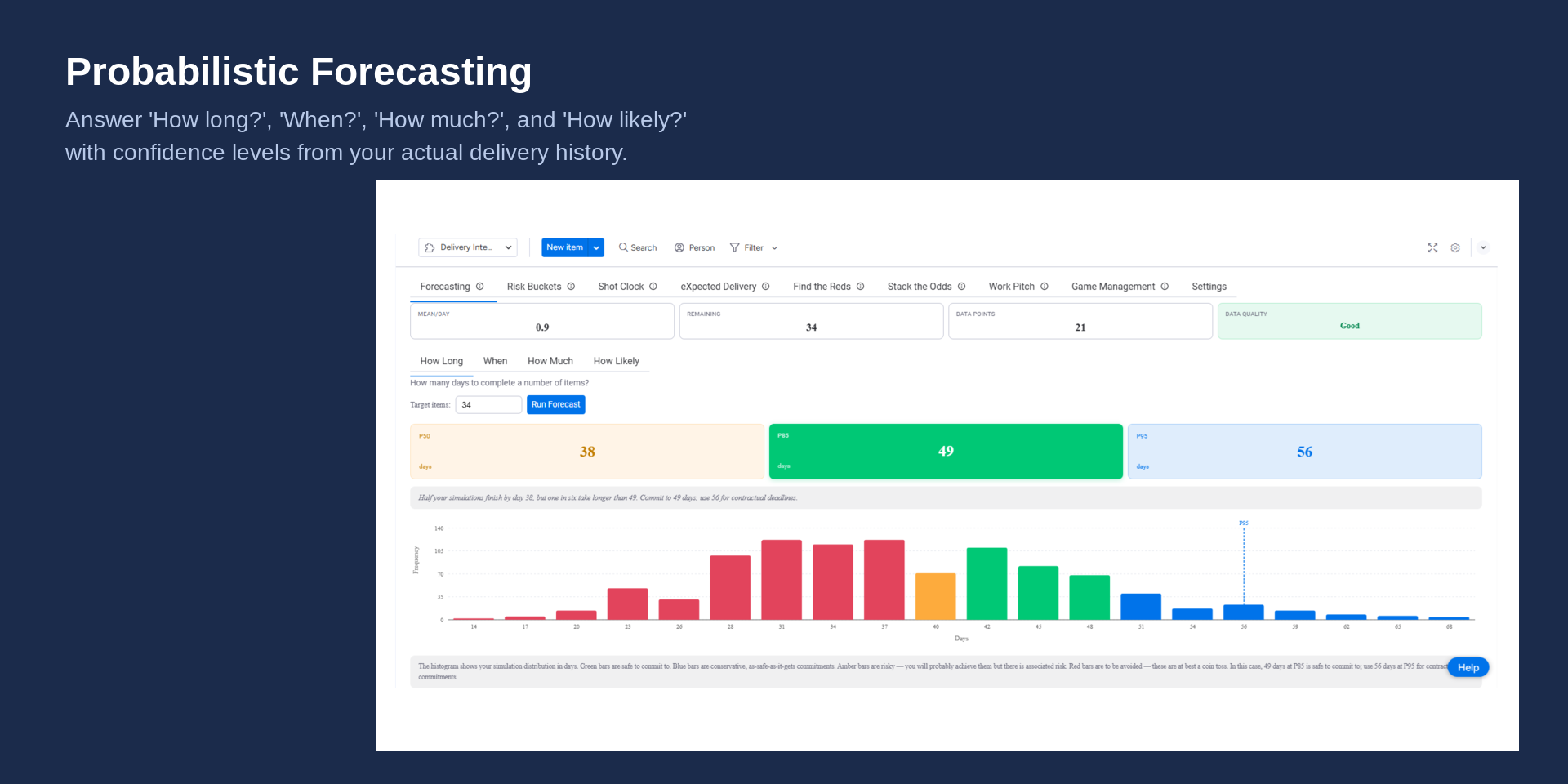 - Probabilistic Forecasting — Four forecast types (How Long, When, How Much, How Likely) powered by your historical completion rates. Colour-coded percentile cards and histogram charts show risk at a glance.