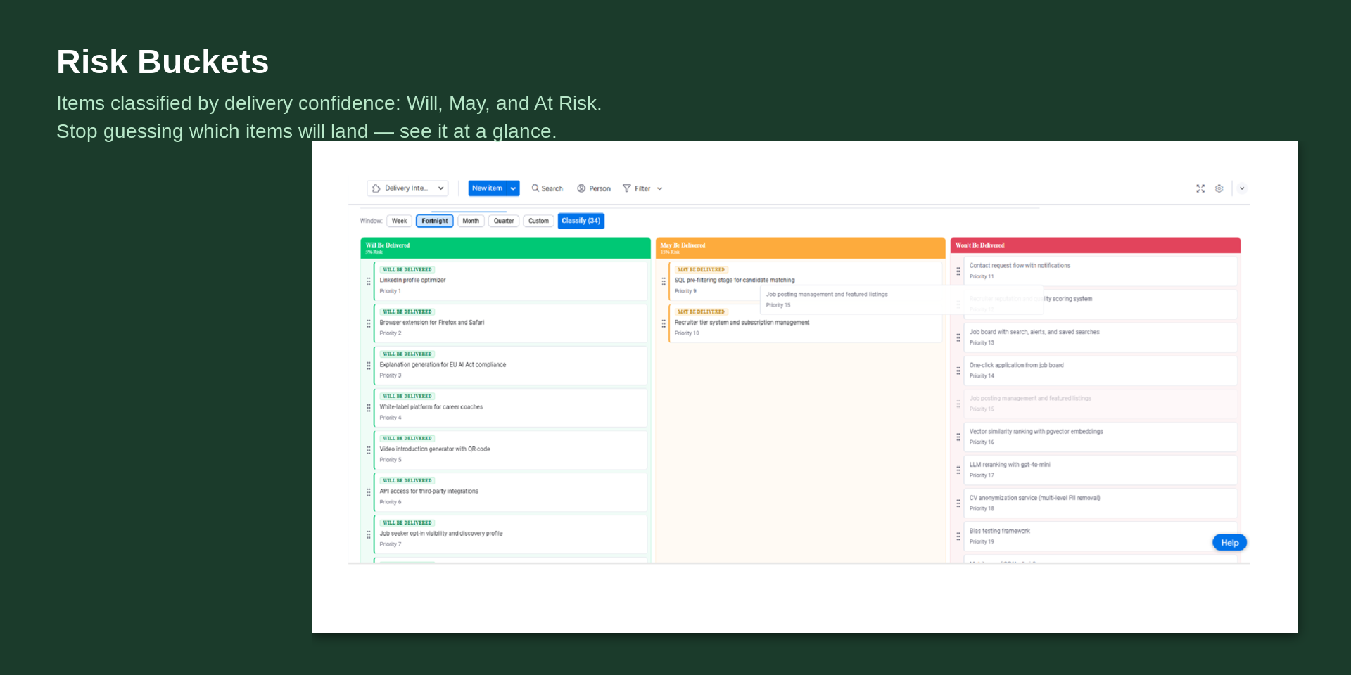 - Risk Buckets — Items automatically classified into Will, May, and At Risk columns based on delivery confidence. Stop guessing which items will land.